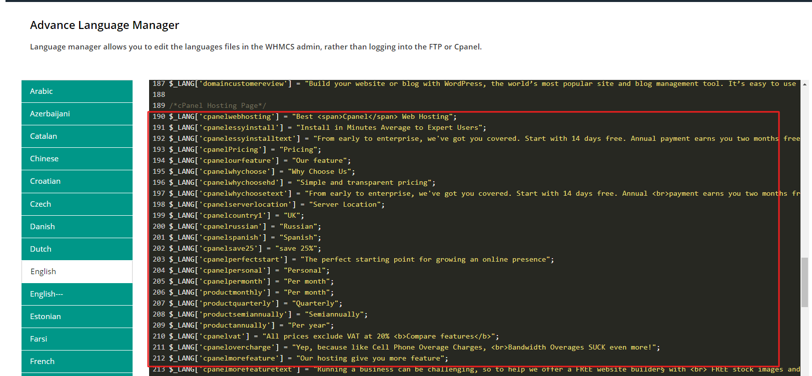 Step 4: Open English.php language and find out the lang variable.