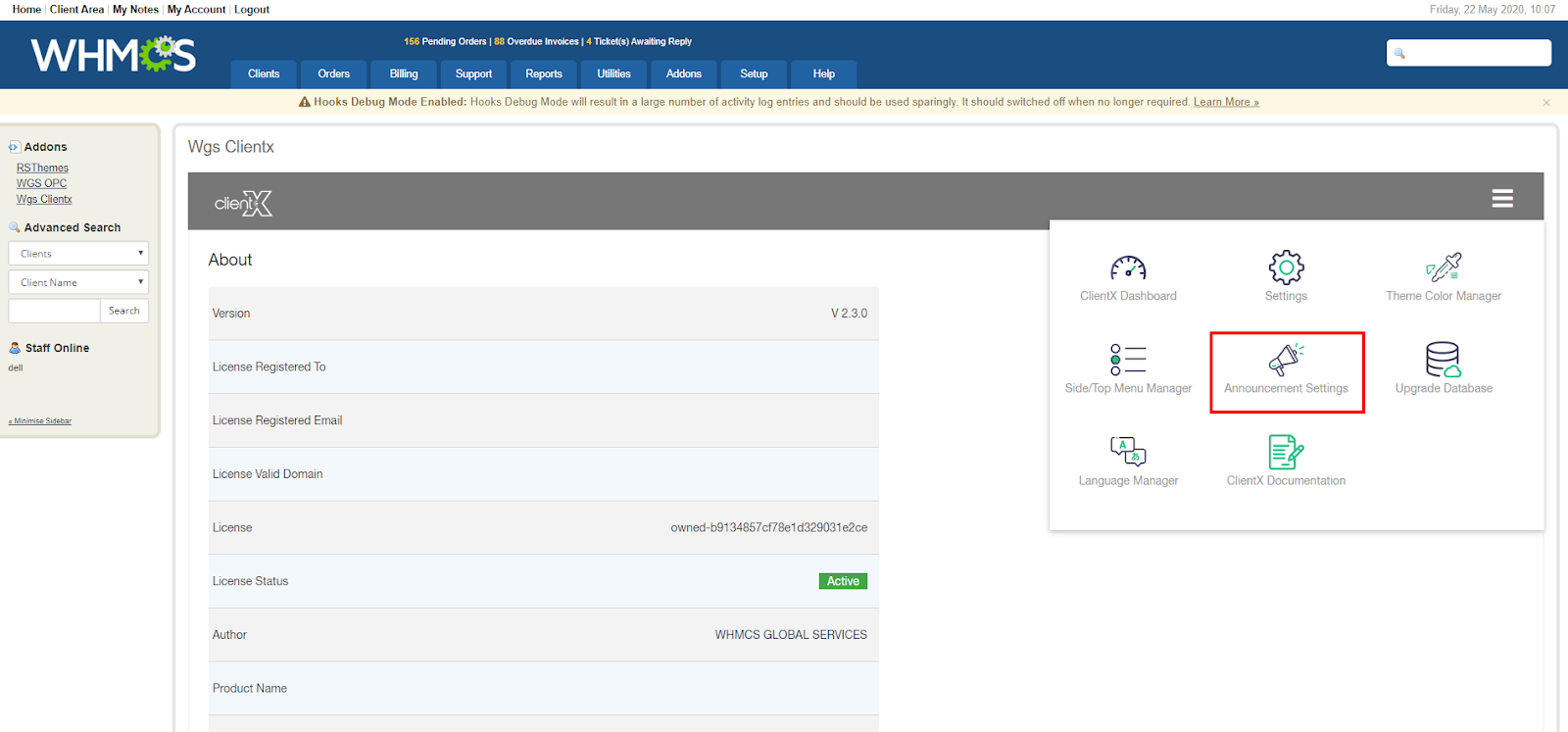 Login WHMCS Admin > Go to Addons > WGS ClientX