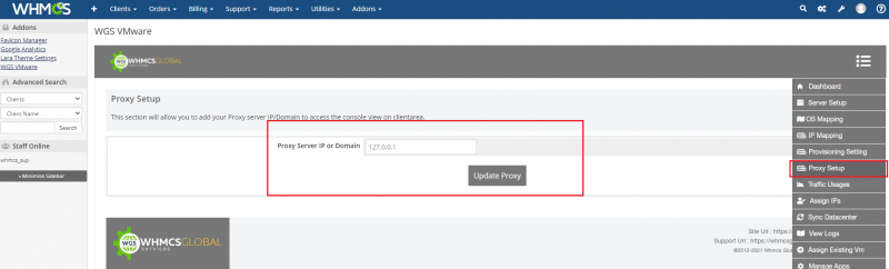After installing the HAProxy, login as your WHMCS admin panel. Go to "Addons" >> "WGS VMware" >> "Proxy Setup". On this setting page enter created proxy server IP or domain name (without https://) and click on "Update Proxy" button to save the setting.