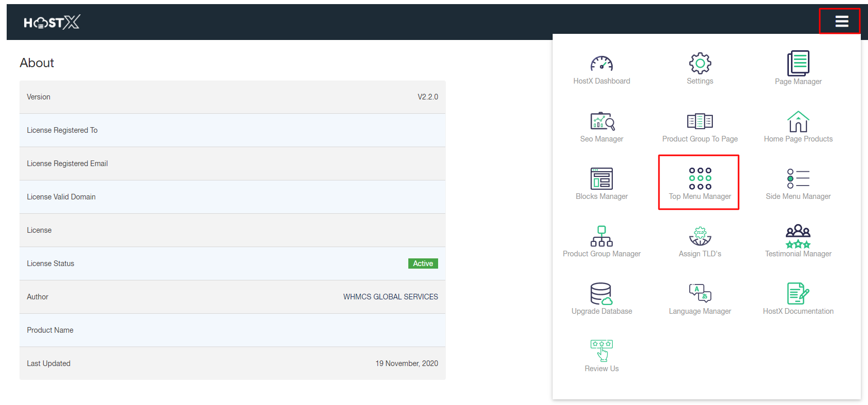 Step 2: Go to Addons > WGS HostX >Top Menu Manager