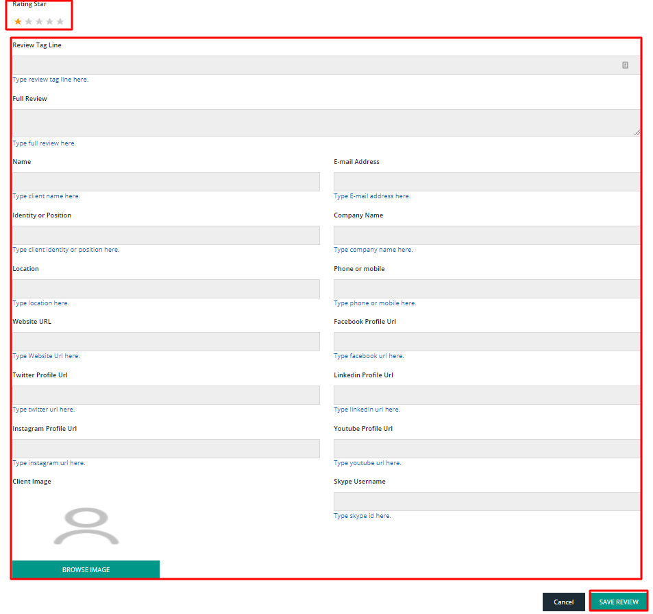 Step 4. Enter the following details: Rating Star, Review Tag Line, Full Review, Client’s Name, Email Address, Identity or Position, Company Name, Location, Phone, Website URLs, Social Media Profiles’ URL, and Client Image. Hit the Save Review button to save the client review details.