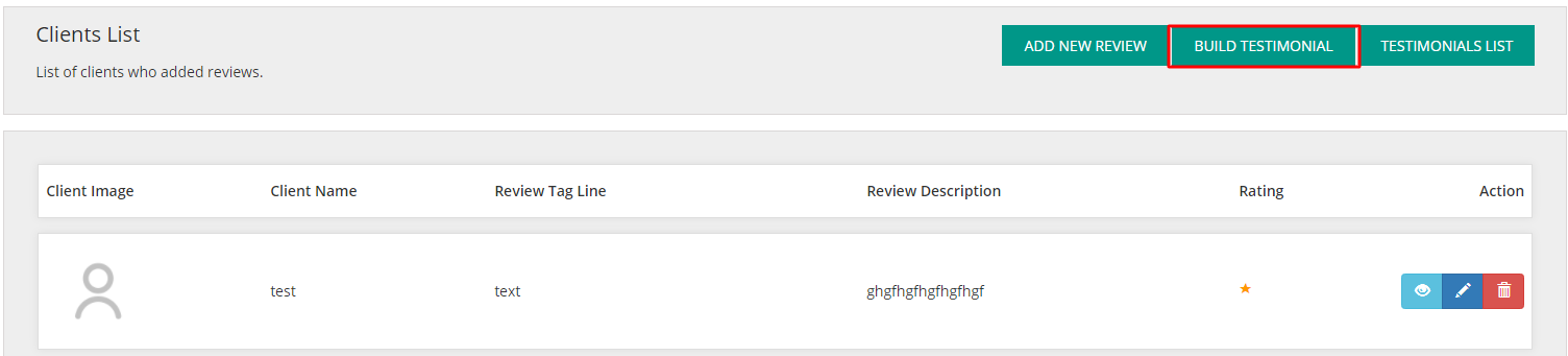 Step 5. Once done with adding reviews, click on Build Testimonial to Build a new testimonial module for a page.