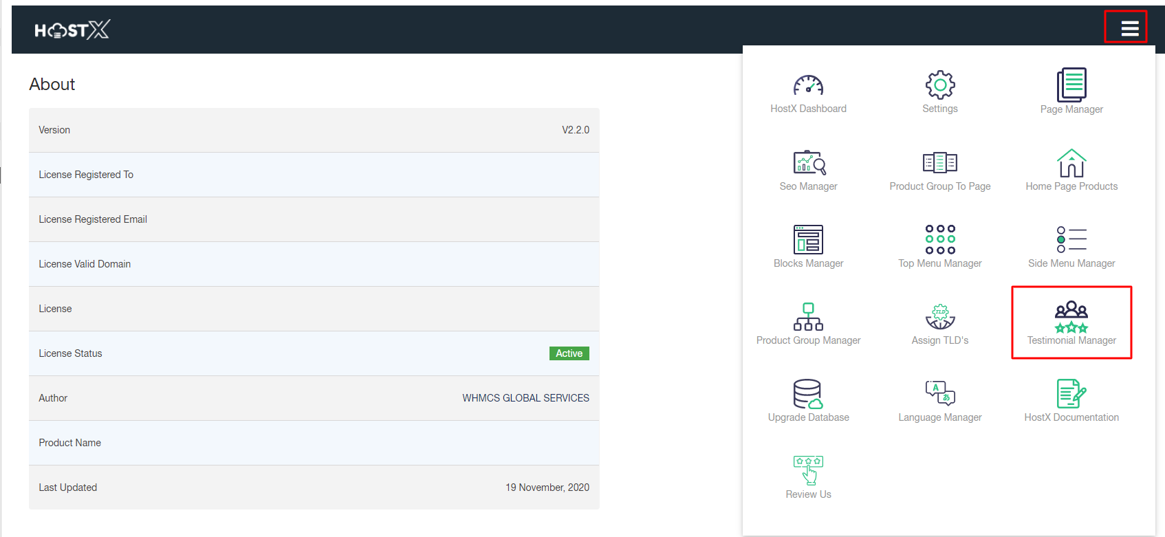 Step 2: Go to Addons > WGS HostX >Testimonial Manager