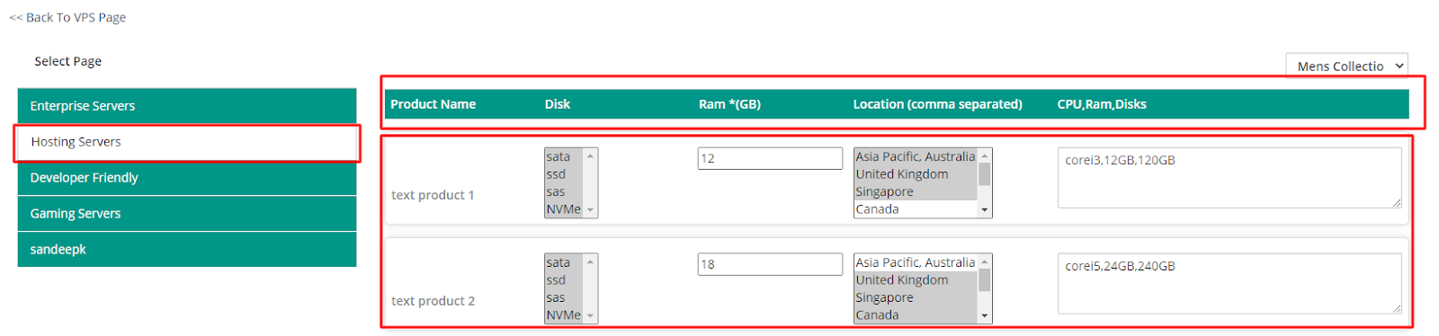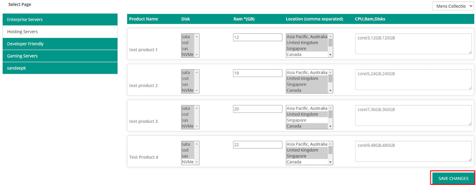 Step 4. Select the page from the left side of the screen and enter the Product Name, Disk, Ram *(GB), Location (comma separated), CPU, and other required information in corresponding fields.