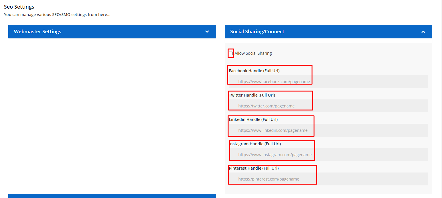 - Allow Social Sharing: Checking this option will create sharing icons on all the existing pages in the client area and will auto create a social sharing link for each web page accordingly.