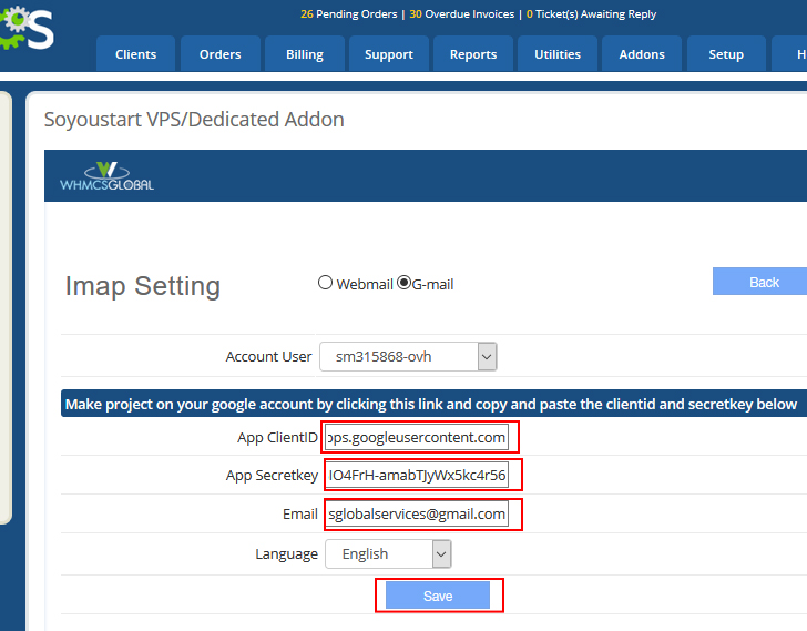 Paste these credentials in WHMCS SoYouStart addon Client ID & Client Secret key respectively. Also enter Email Address.