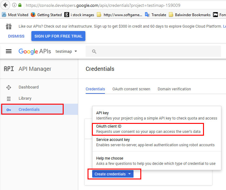 - Click the bottom tab Credentials and then click on create crdentails and you will get a pop up and then select OAuth client ID