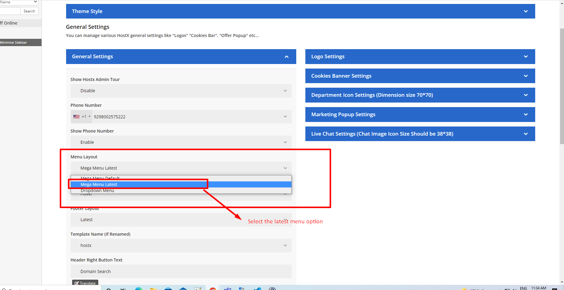 Step 5: In the general setting Drop down the Menu Layout and select the Mega Menu Latest you will see in the below screenshot.