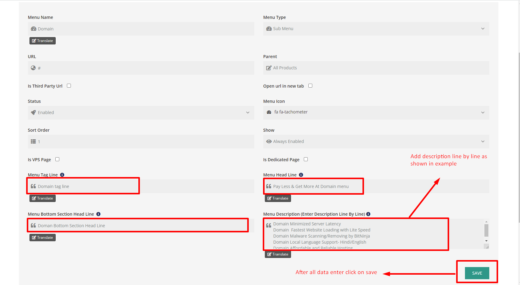 Step 9: After Click on the edit option where you enter the date in the Menu tag line, Menu Headline, Menu Bottom Section Head Line, Add the Menu Description (Enter Description Line By Line). After all, data enter click on Save