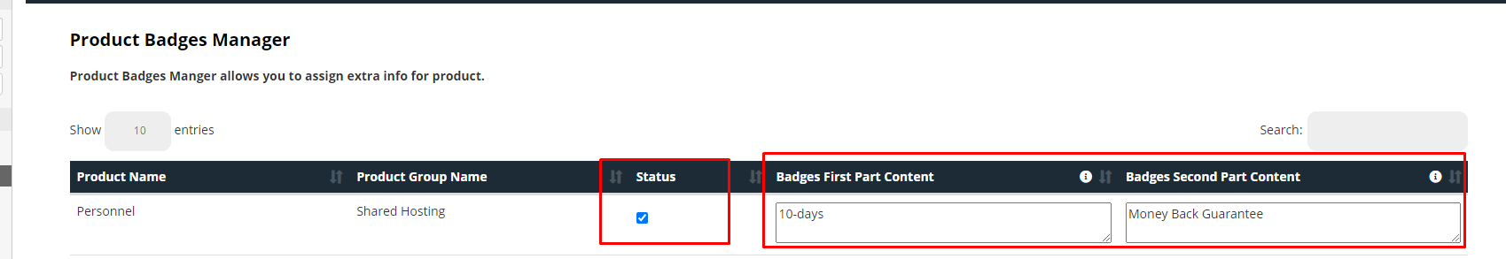 Step 3: Go to Product Badges and give a description for the badges, as well as enable/disable the status, before clicking the Save button.