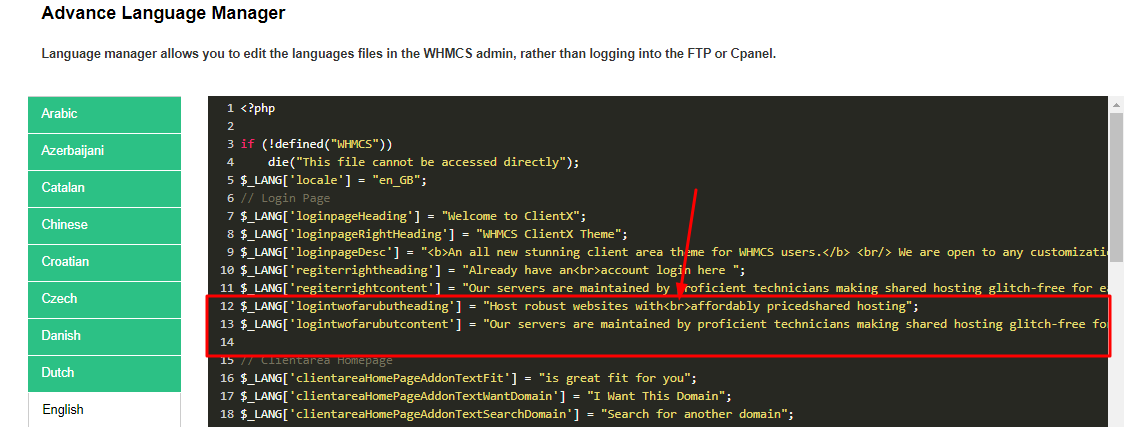 Step 4: After selecting the language you will see a screen similar to screenshot below and then you can change the text written inside the double quotes as per your choice.