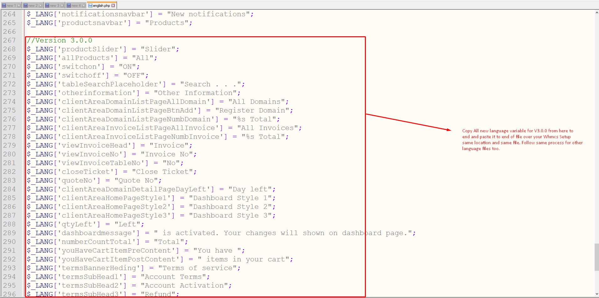 Step 6: Copy all new language variable for V3.0.0 from here to end and paste it to end of file over your WHMCS file setup at same location and same file.