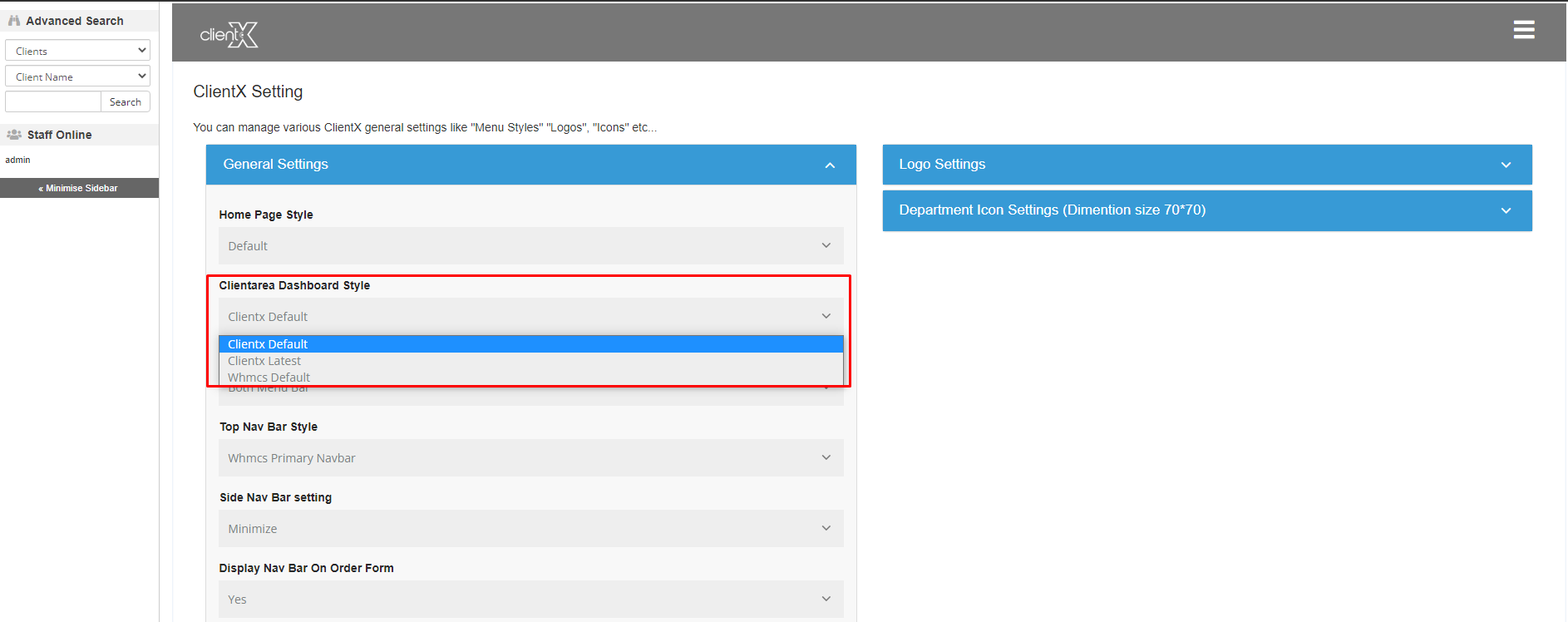 Step 4: In General setting you can see the Clientarea Dashboard Style. In Clientarea Dashboard Style when you will click on the dropdown you will see three options (1)Clientx Default, (2) Clientx Latest and (3) WHMCS Default from here you can change Clientarea Dashboard Style and then click on save changes after selecting any of the option you want to select.