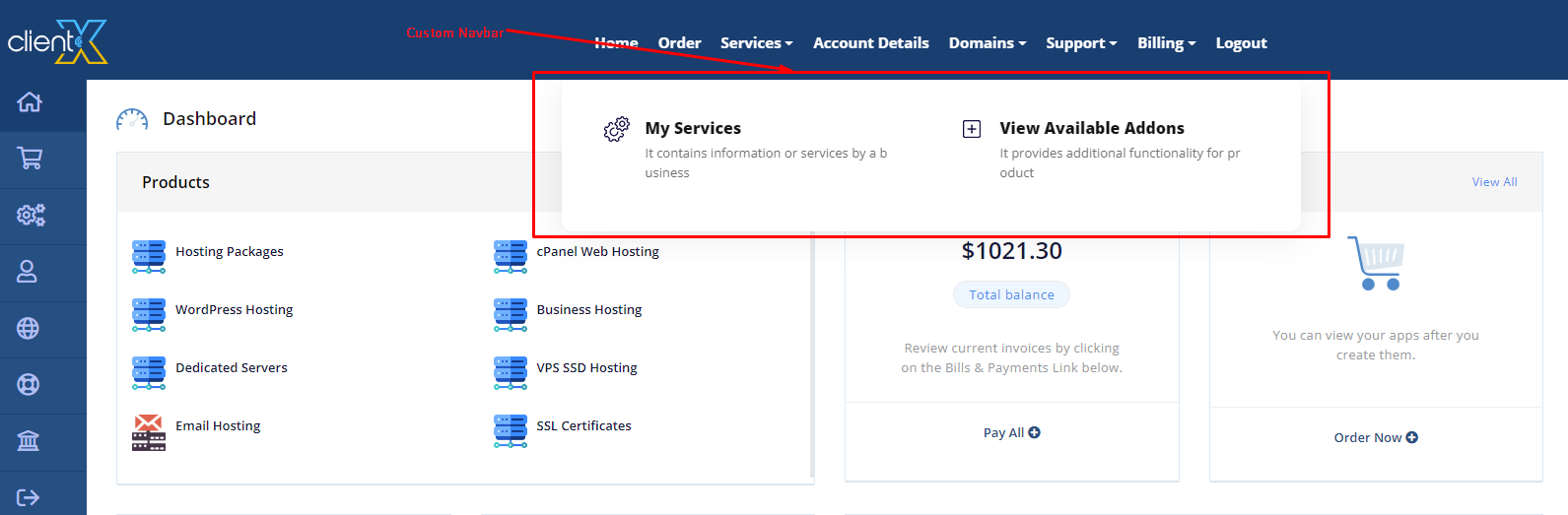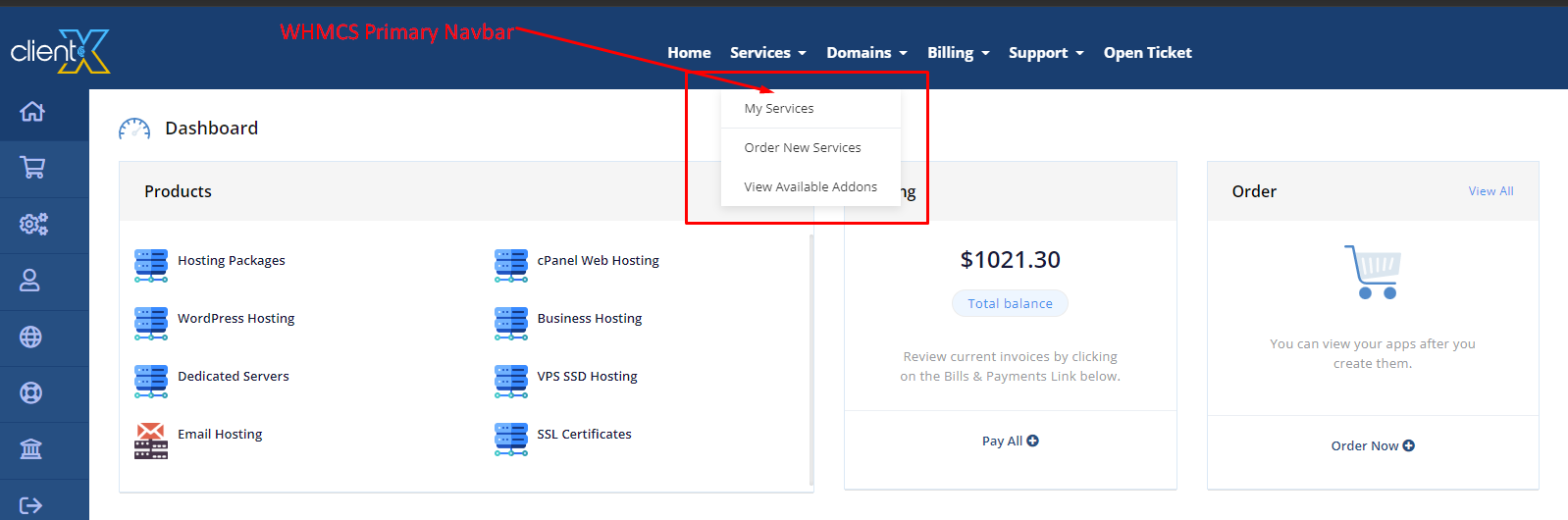 Step 6: By clicking on WHMCS Primary Navbar it will look in the frontend as shown below