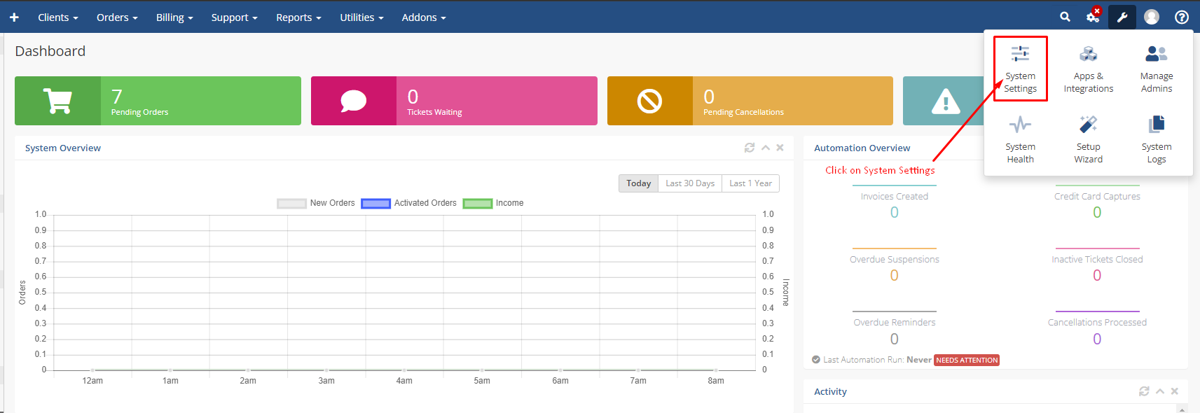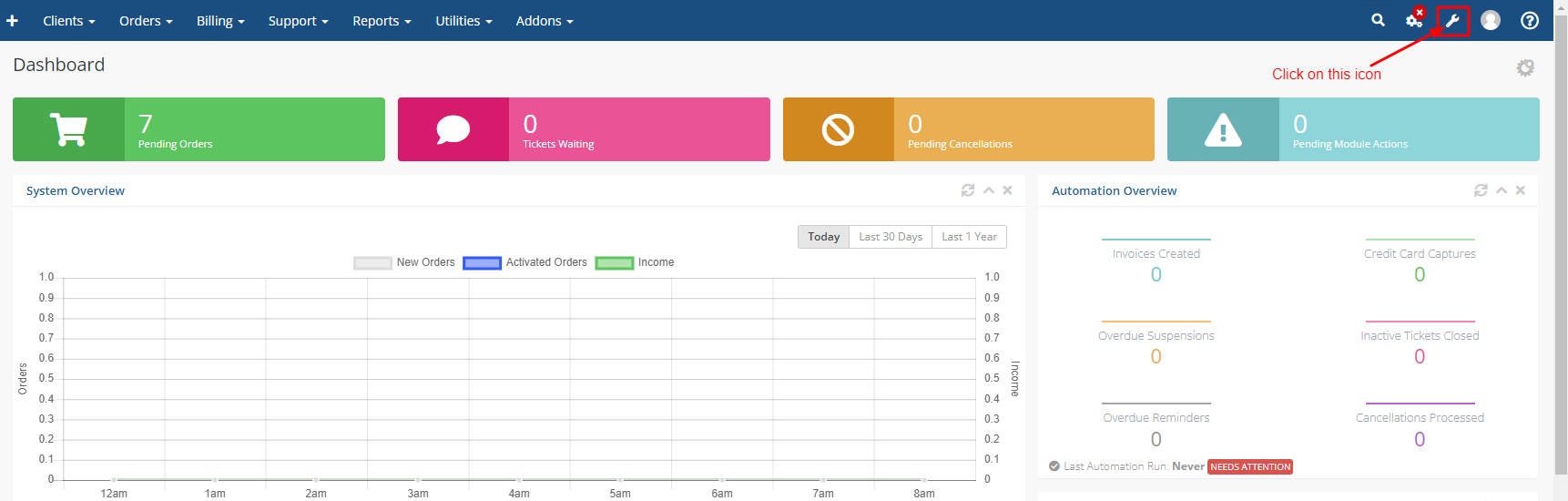 Step 1: Go to WHMCS admin > click on this icon as shown in the screenshot below
