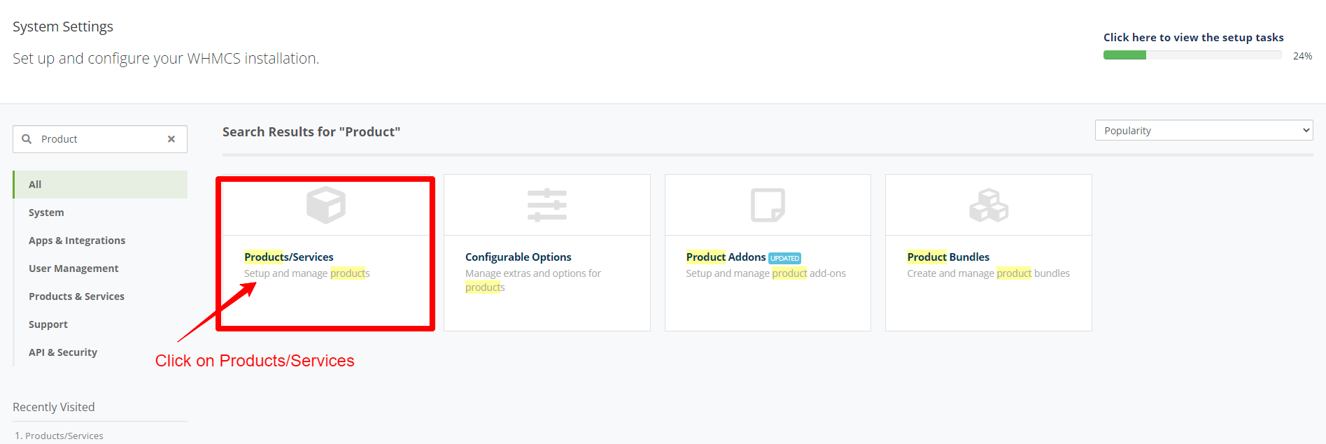 Step 3: In the Search bar search for the Products/Services then click on at "Products/Services"