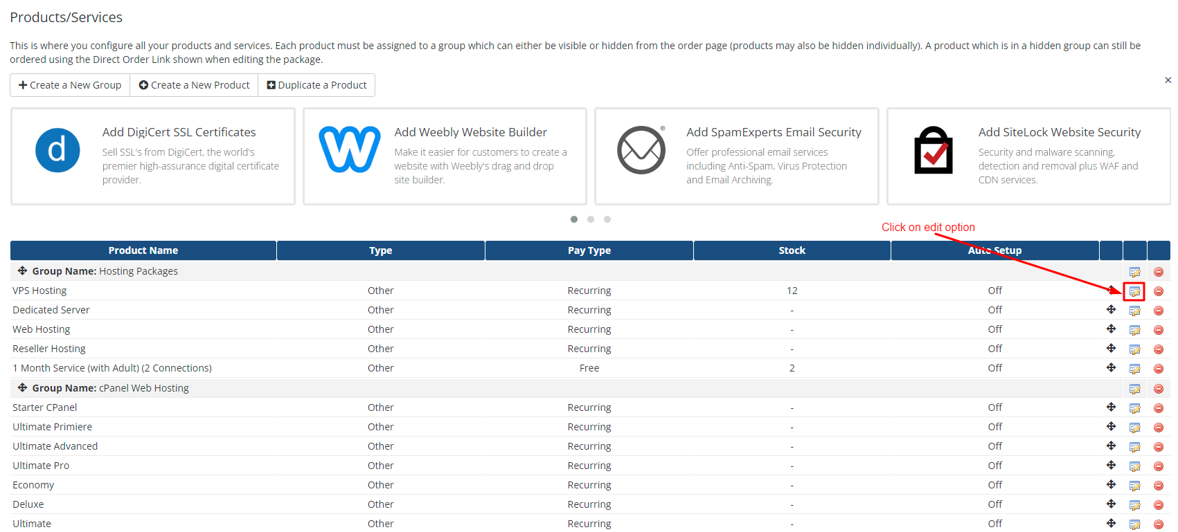Step 4: After clicking on Products/Services you will see the list of products then choose any of the product, and click on the edit option as shown in the screenshot below