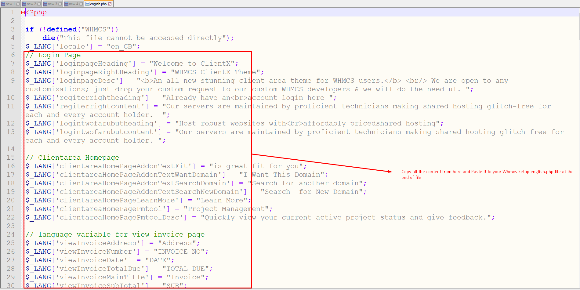 Step 6: Copy all the content from here and paste it to your WHMCS setup english.php file at the end of the file. setup at same location and same file.
