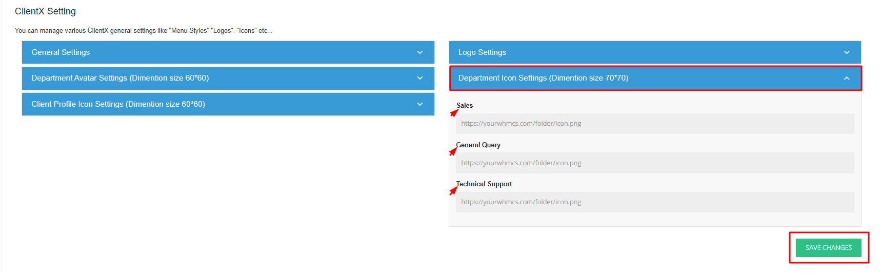 In order to change your customer support modes and settings, click on Department Icon Settings (Dimension size 70*70) menu and enter the relatable images in above field and then click on save changes.