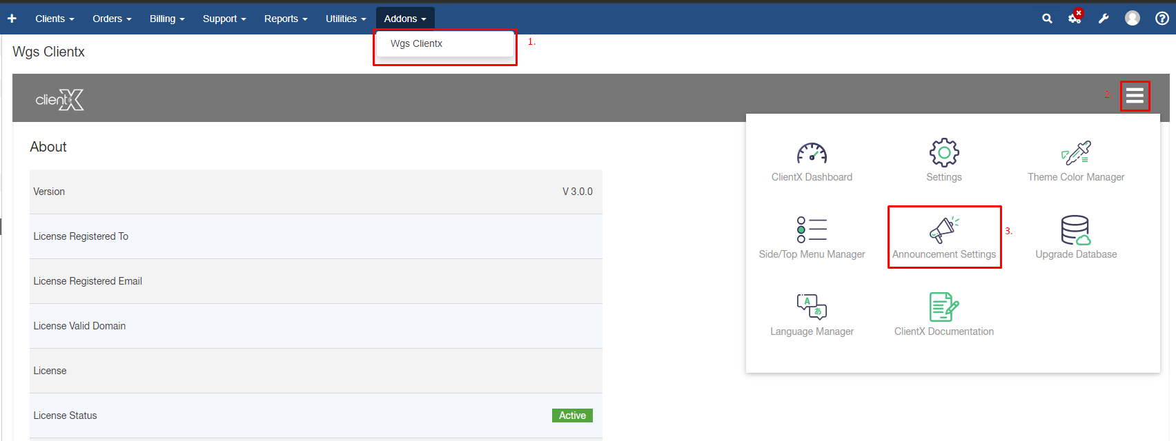 Step 2: Go to Addons > WGS ClientX > Announcement Settings