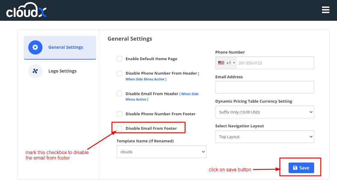 Step 3: After clicking on the setting button you will see the general settings as shown in the screenshot then Disable the Email from the Footer and click on the save button.