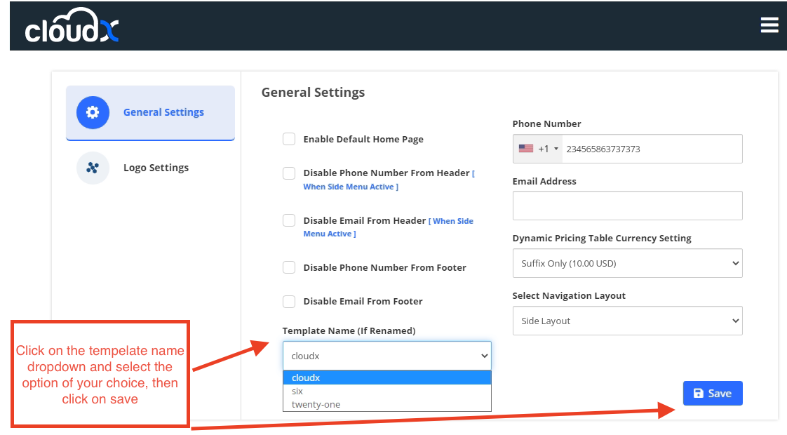 Step 3: After clicking on the setting button you will see the general settings as shown in the screenshot then select the template name and click on the save button