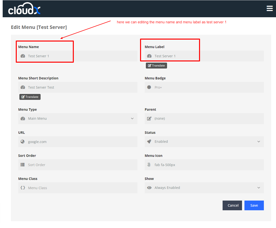 Step 4: After that you will make the changes for example in this screenshot here added Test Server under Menu Name & Menu label, Menu Description similarly you can add as many you want and then click on save button.
