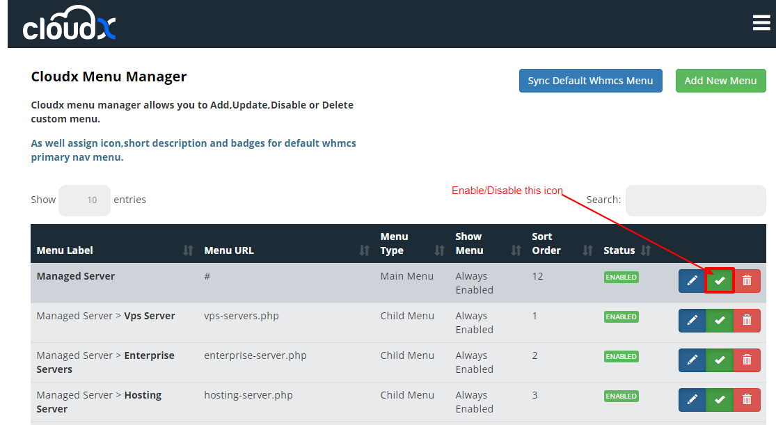 Step 3: Search the page name and click the Green Check button to enable/disable it from the client area.