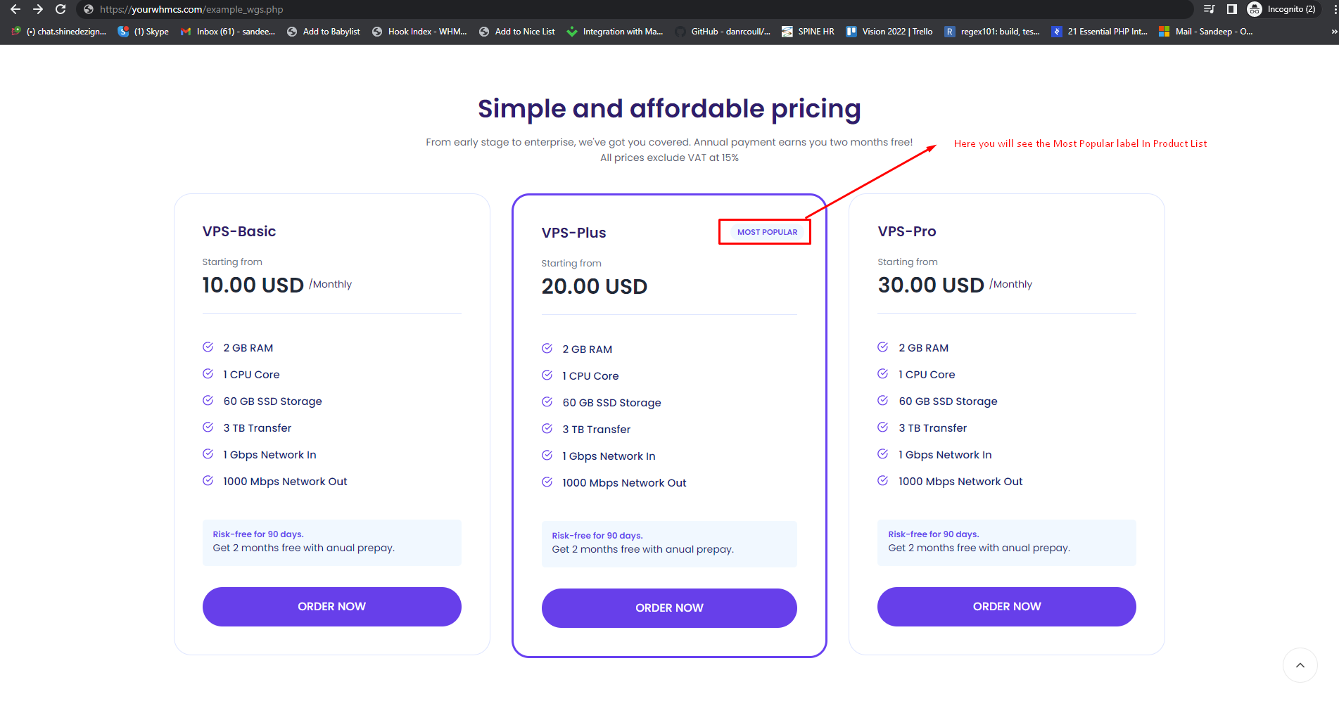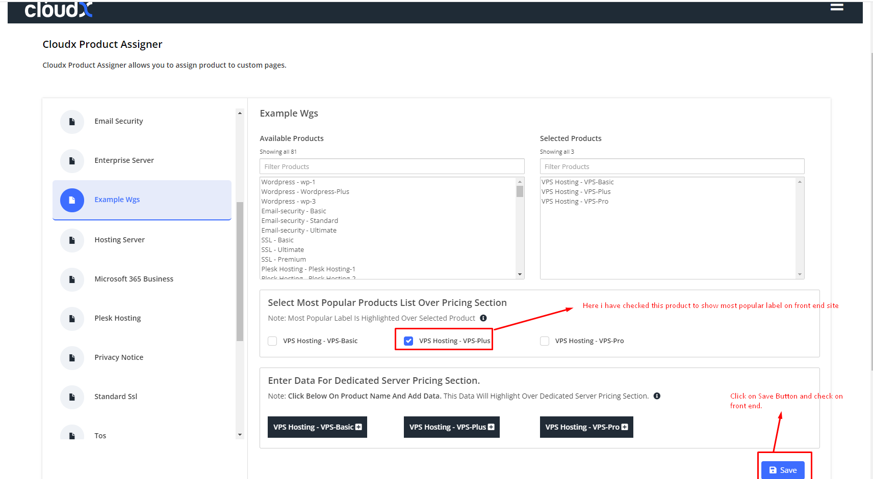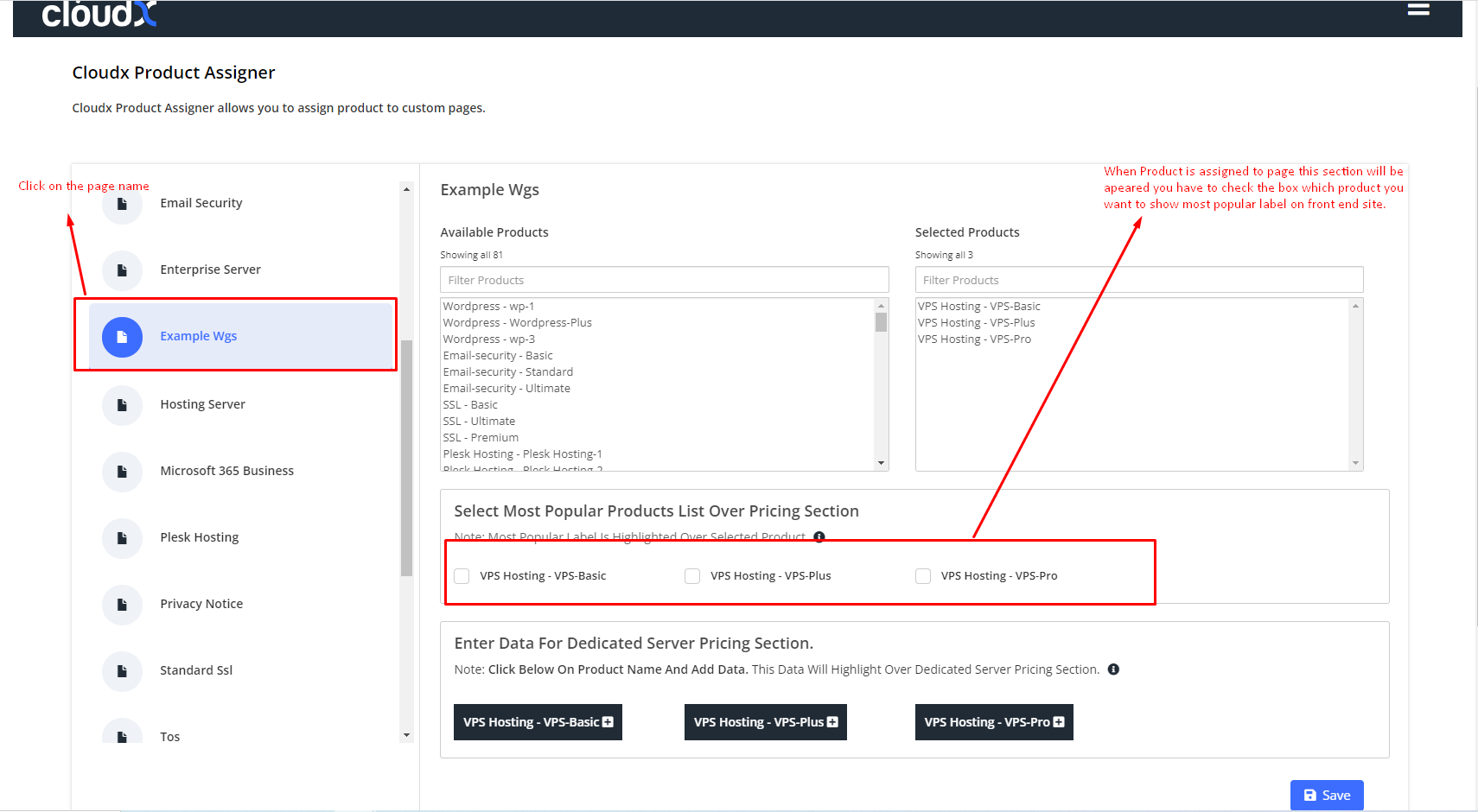Step 3: On the left-hand side click on the page name. Then click on this checkbox and select the most popular products list over pricing section. On the right-hand side when product is assigned to page then this section will be appeared now you have to check the box which product you want to show the most popular label on frontend side.