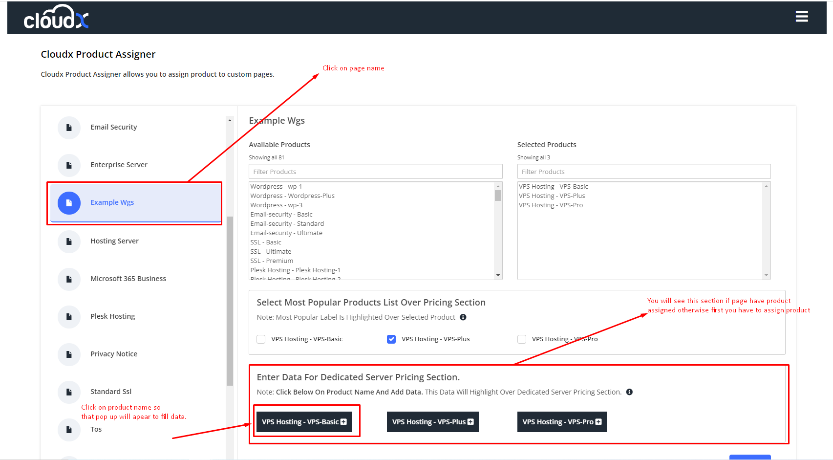 Step 9: On left-hand side click on page name and on right-hand side click on the product page so that popup will appear to fill the data. Now you will see in the below screenshot this section if the product assigned otherwise first you have to assign the product.
