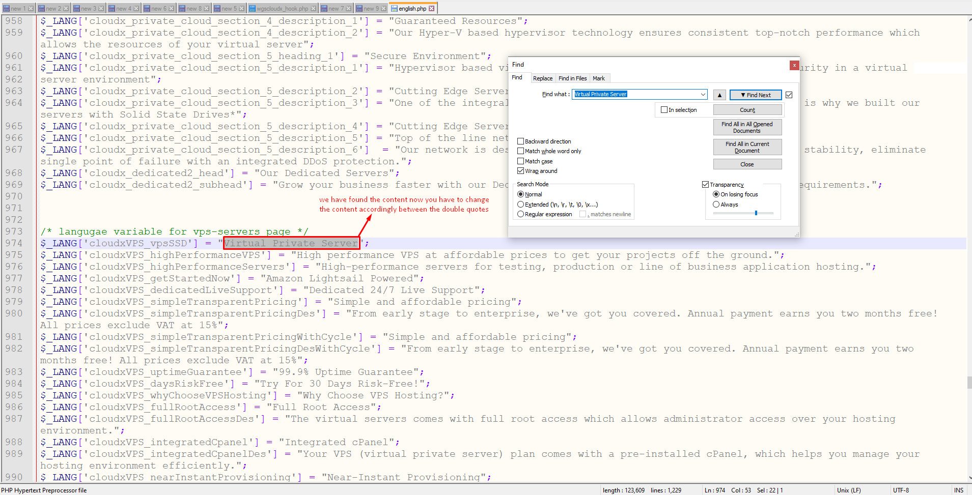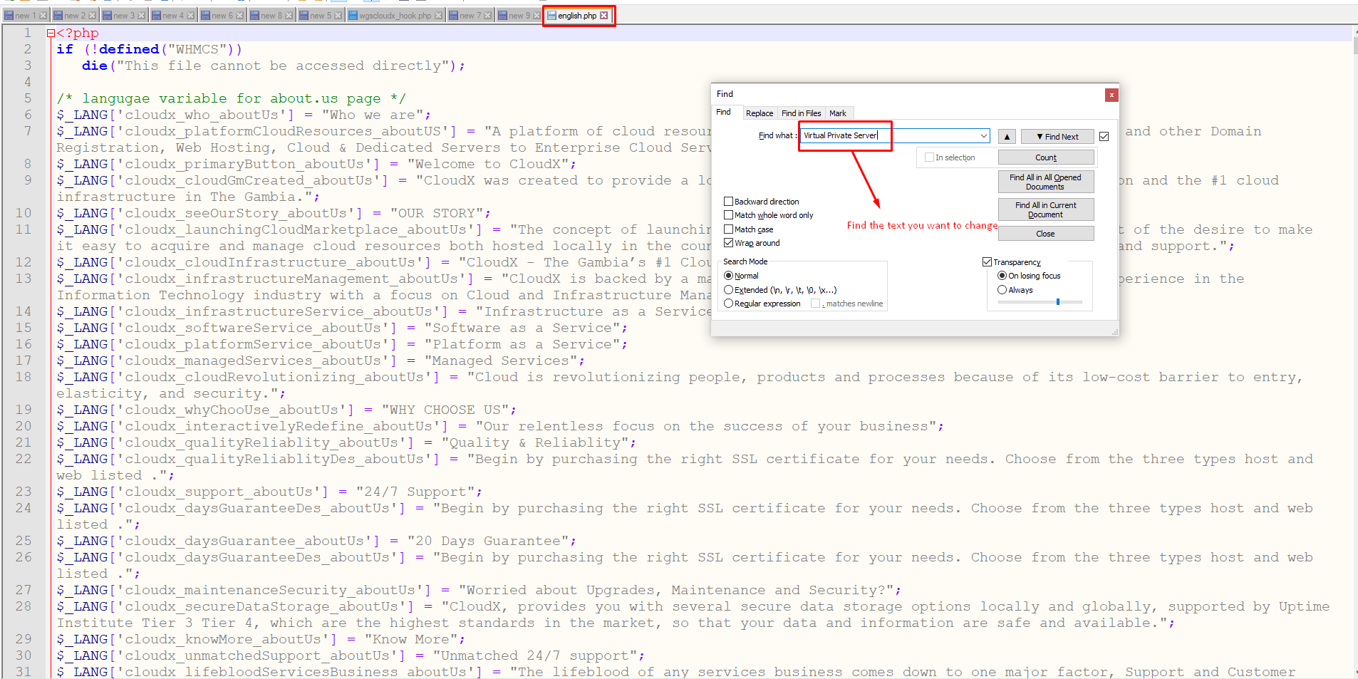 Step 7: Find the text you want to change. For example we are searching for "Virtual Private Server" in the below screenshot.