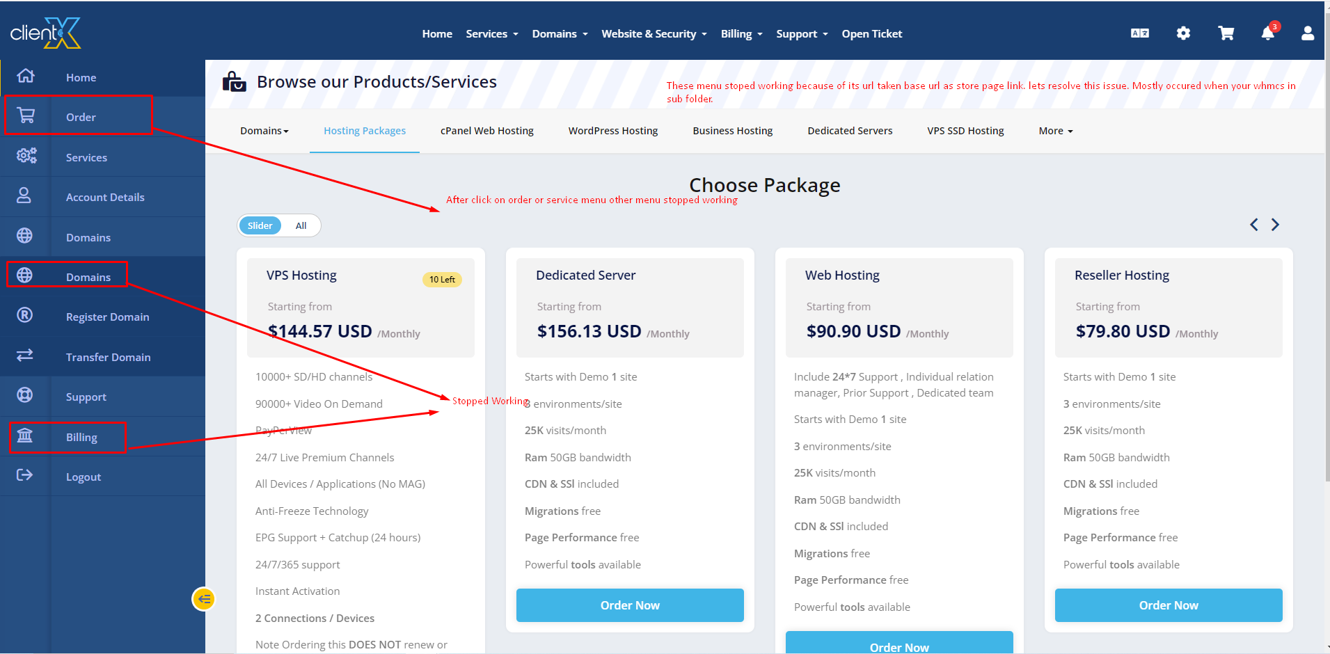This usually occurs because the URL of the menu takes the base URL as the store page link, Mostly you will encounter this issue in the WHMCS subfolder.