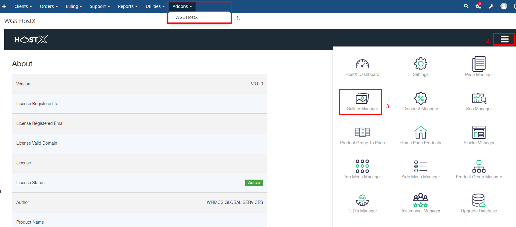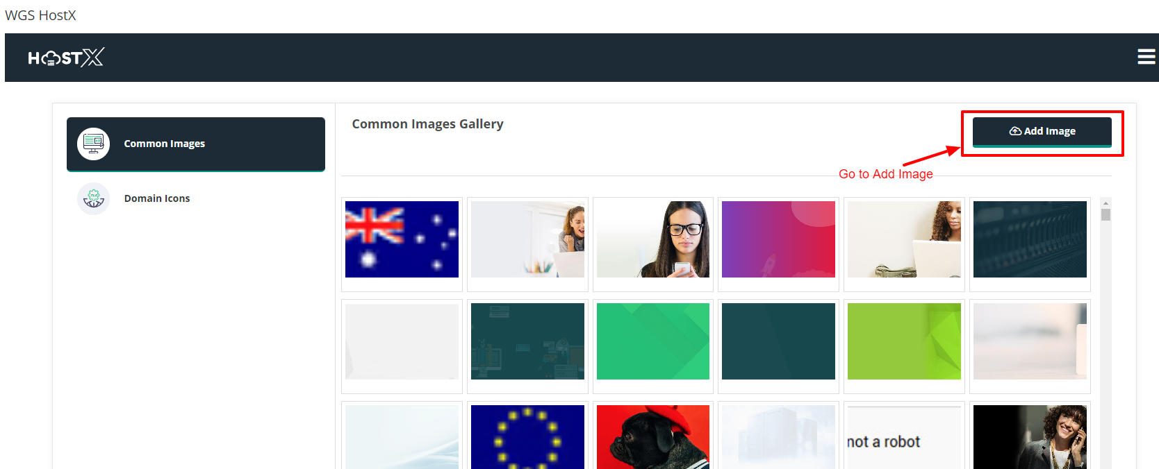 Step 1: Log in to WHMCS Admin Step 2: Go to Addons > WGS HostX > Gallary Manager Step 3:Now, go to "Add Image" and upload the image from the gallery according to your choice.