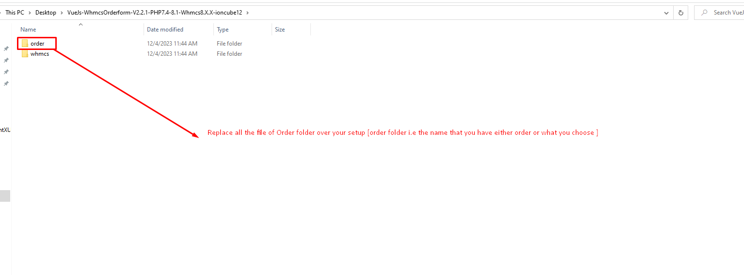 Step 2: Open the Vue.js WHMCS order form folder. You will find the 'order' folder. Replace all the files in your setup with these. In the screenshot, we named it 'order,' but adjusted it as per your naming convention.