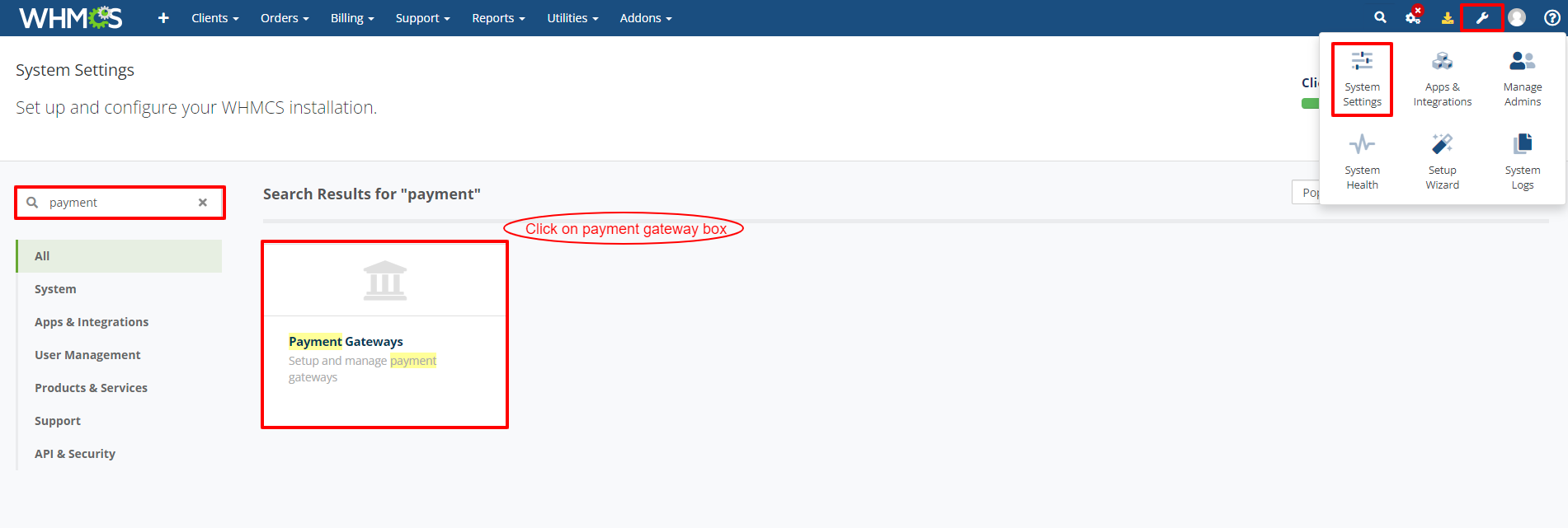 Step 2: At the top right side, hover on the "Wrench icon" and then go to System Settings >> Find "Payment Gateway".