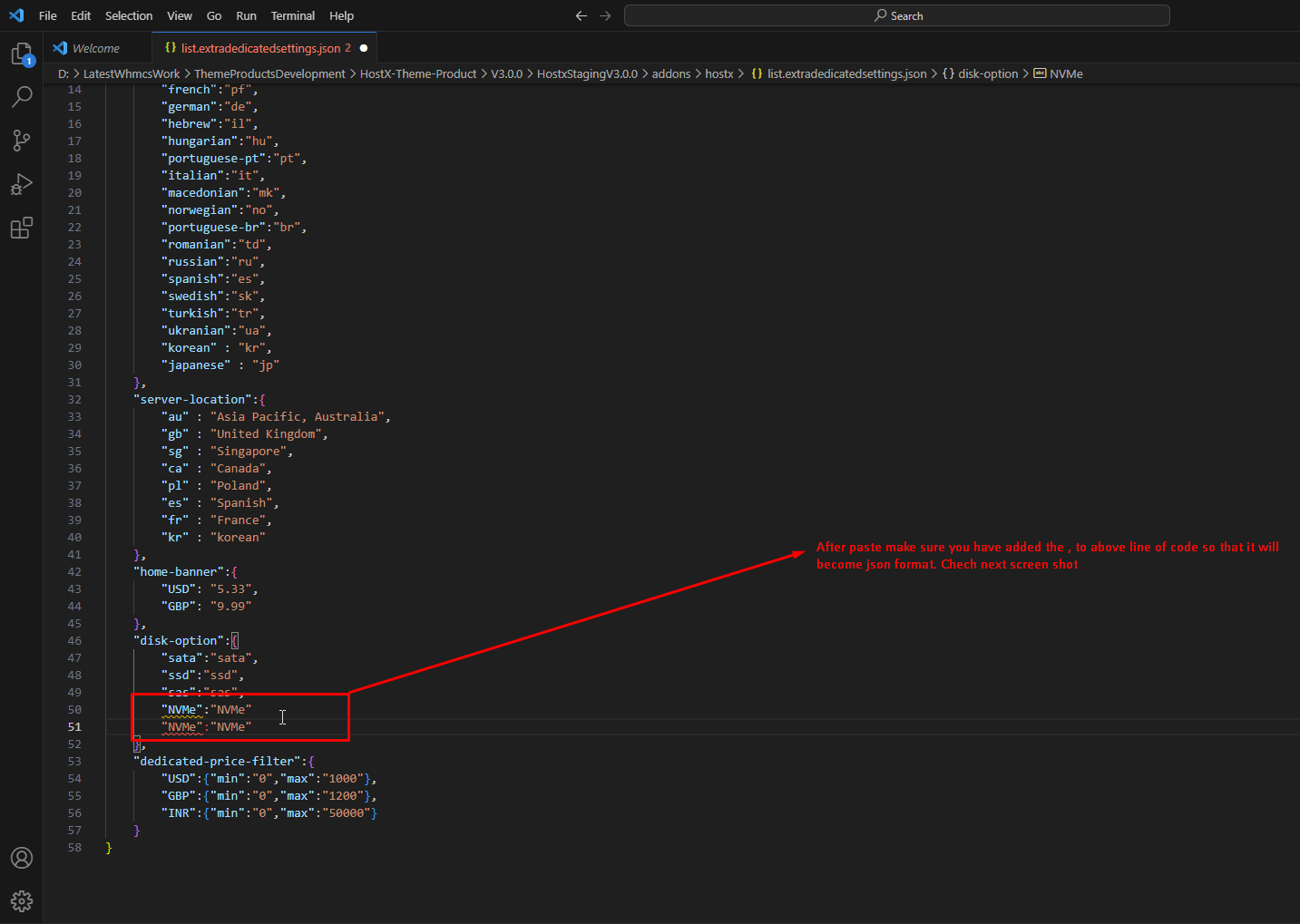 Step 9:-After pasting make sure you have added the , to the above line so that format can be changed into json format.
