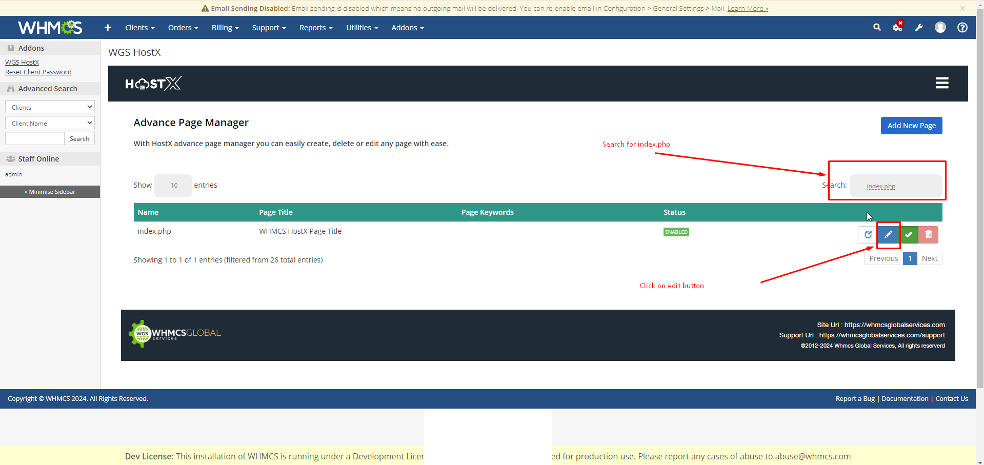 step 3:- Search for index.php in the search bar and click on the edit button as shown.