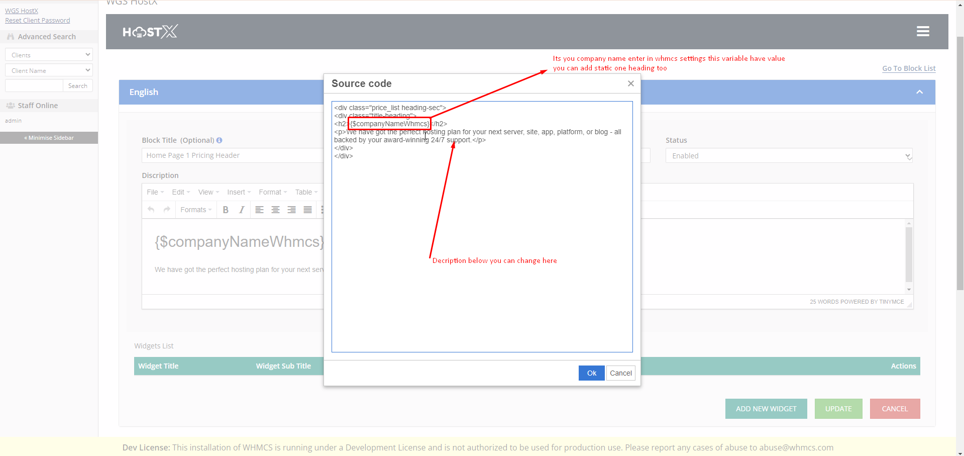 step 7:- Now you will see that its your company name enter in WHMCS setting this variable have value you can add static one heading too.