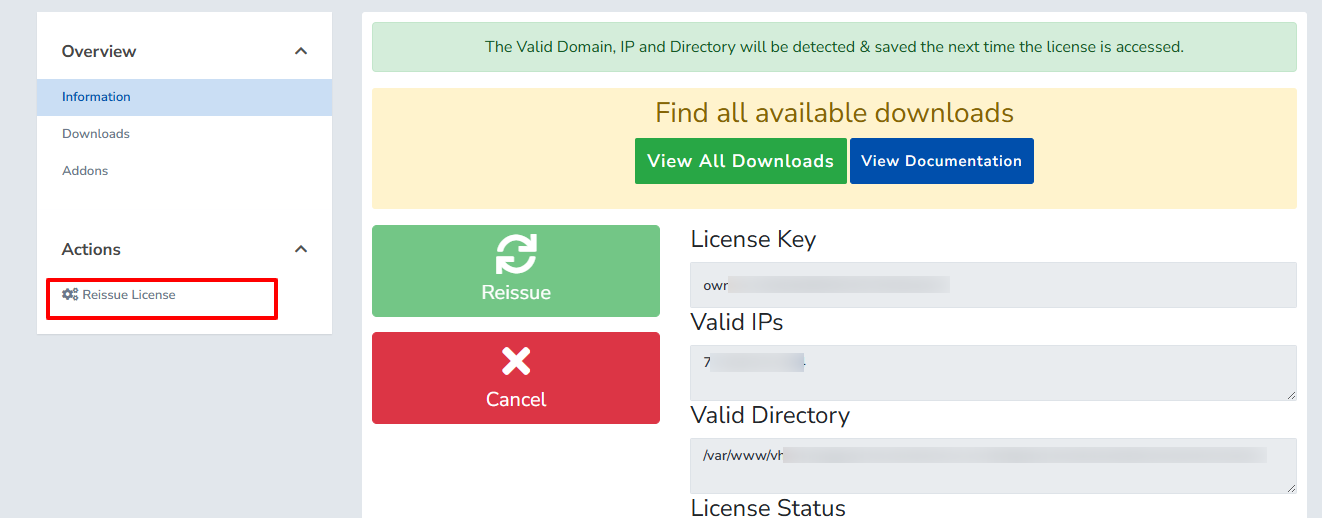 Reason 2). Check the license path and compare with whmcs base dir path. To check the path login in your WGS client area and on dashboard you can see the active product and here you can find the Manage Service link click on that icon it will redirect you on Product Service details page under domain section you can see the Installed license path if your path is invalid than it will show you invalid license so just reissue the license or open the ticket to WGS support team here