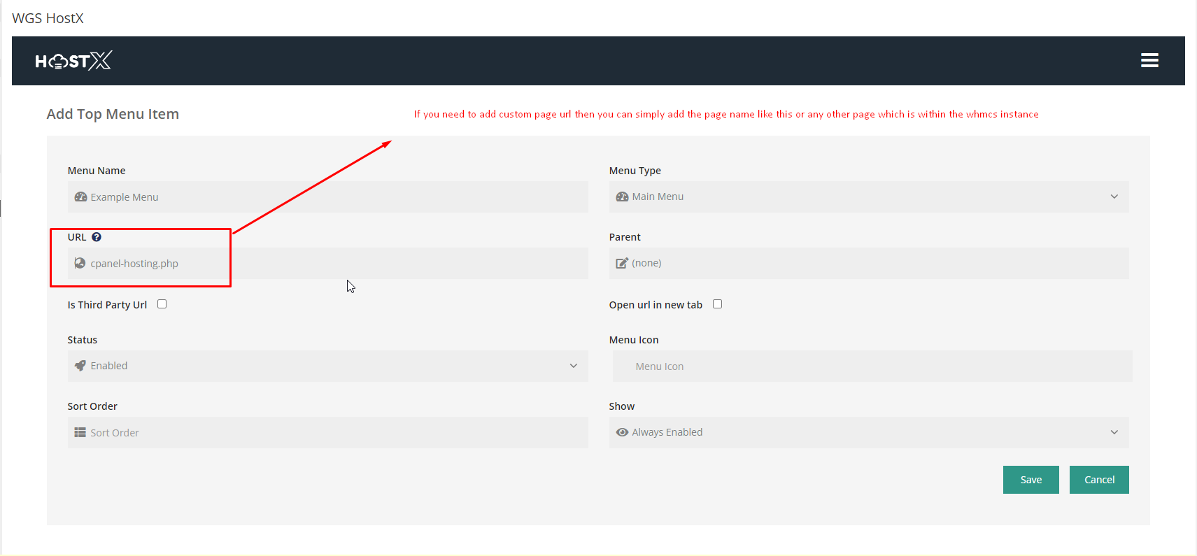 1. If you need to add custom page url then you can simply add the page name like this or any other page which is within the whmcs instance .