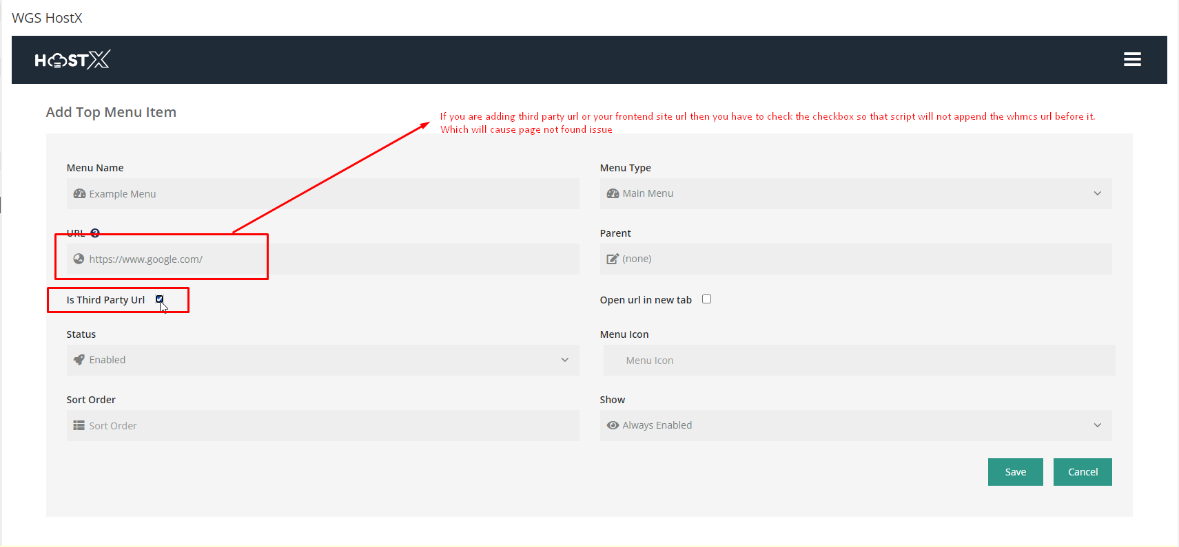 2. If you are adding third party url or your frontend site url then you have to check the checkbox so that seript will not append the whmes url before it Which will cause page not found issue.