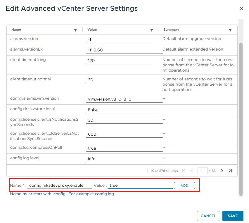 - In the Name text box, enter the name of the service - config.mksdevproxy.enable.