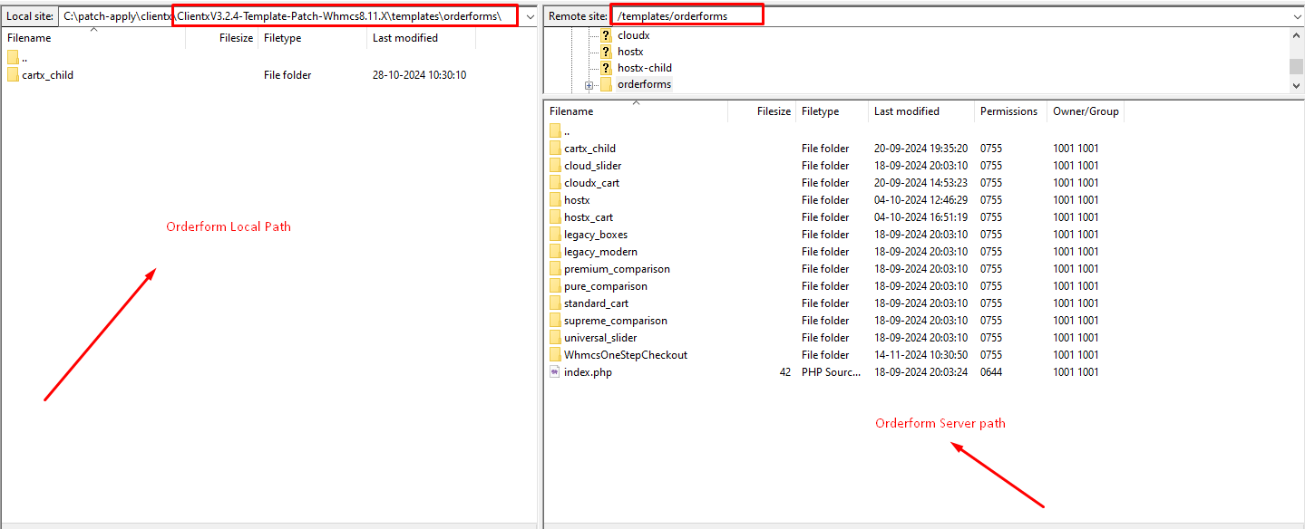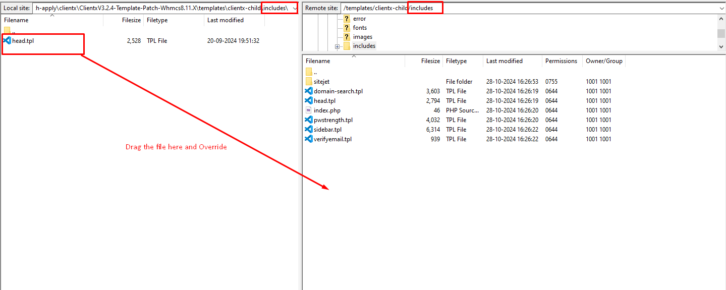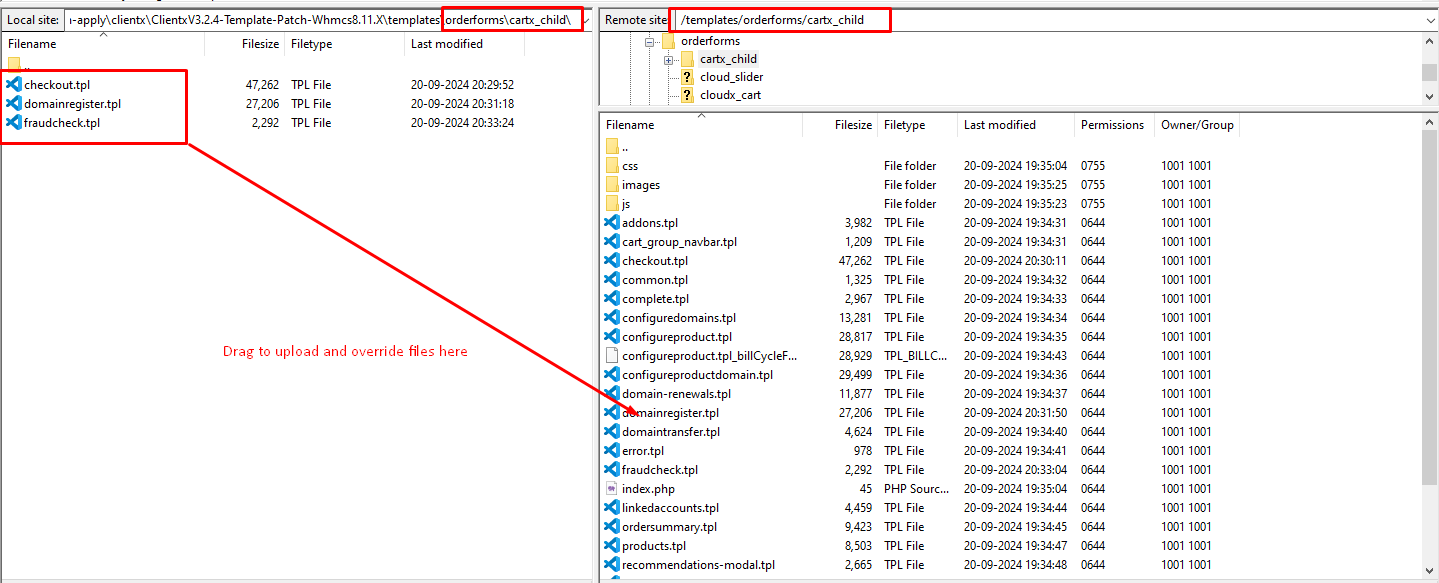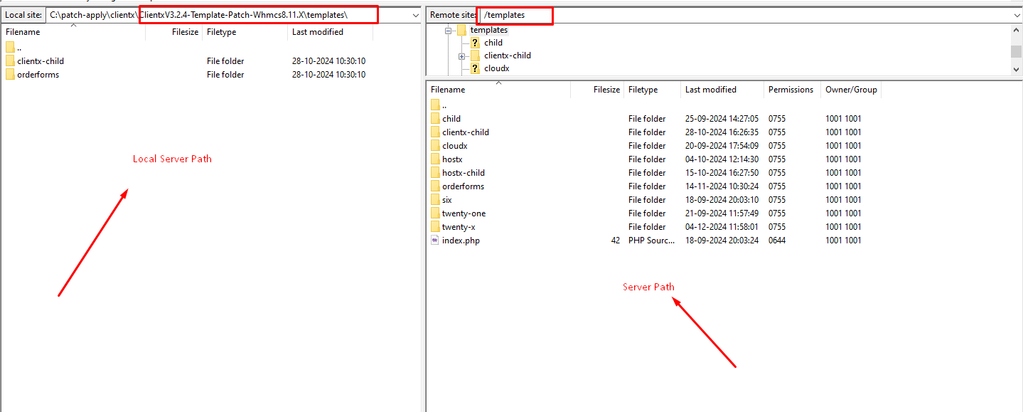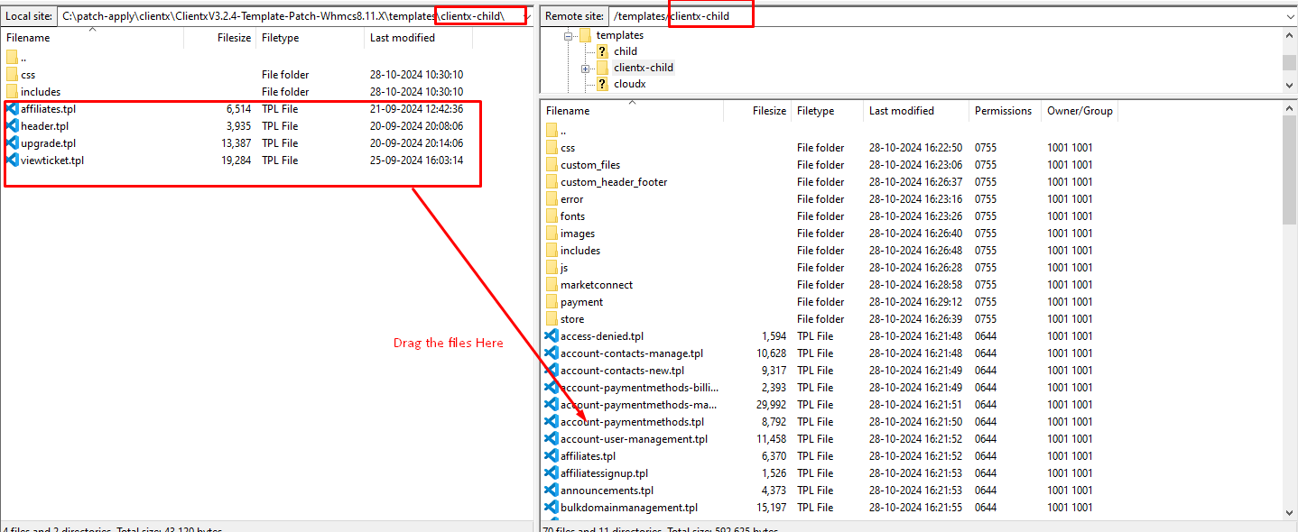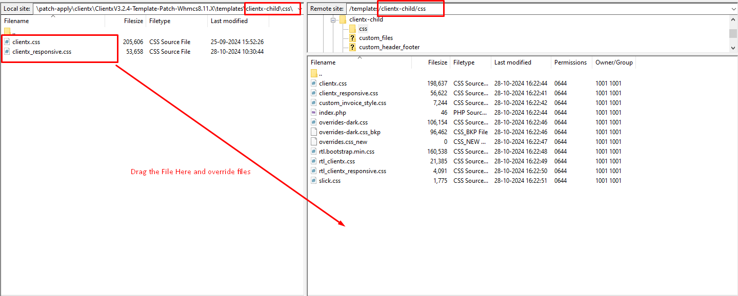 Step 2: After extracting the patch got to the path as shown in the screenshot (\whmcs\templates\clientx-child\ -> In local ) and (/templates/clientx-child/ -> In server )