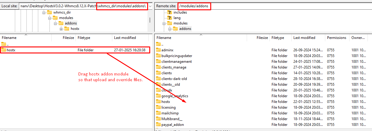 Step 4: After extracting the build go to the path as shown in the screenshot (\whmcs\modules\addons\ ->In local ) and (/modules/addons/ -> In server ). For addon module to upload “hostx” patch and override files screenshot given below.