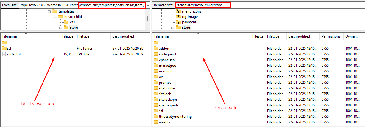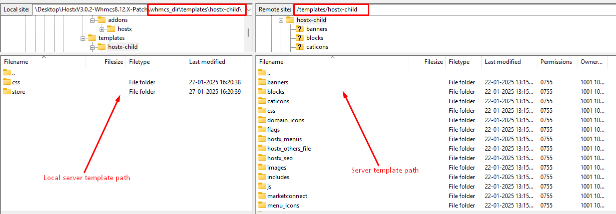 Step 5: Now navigate to the path shown below in the screenshot on both local and server for templates file, (\whmcs\templates\hostx-child -> In local ) and (/templates/hostx-child-> In server ). For template files.