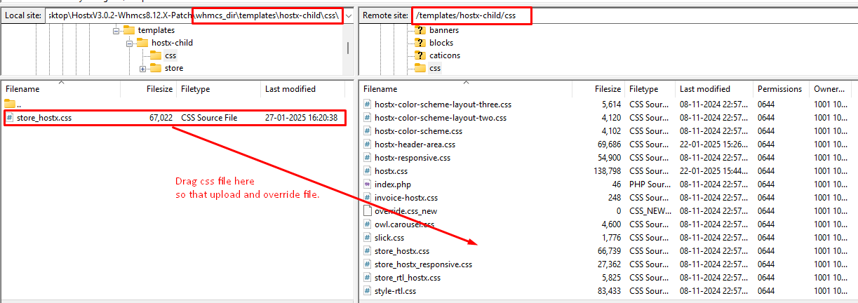 Step 6. Now Drag the file to upload “css” patch file (“store_hostx.css”) and override file screenshot given below.