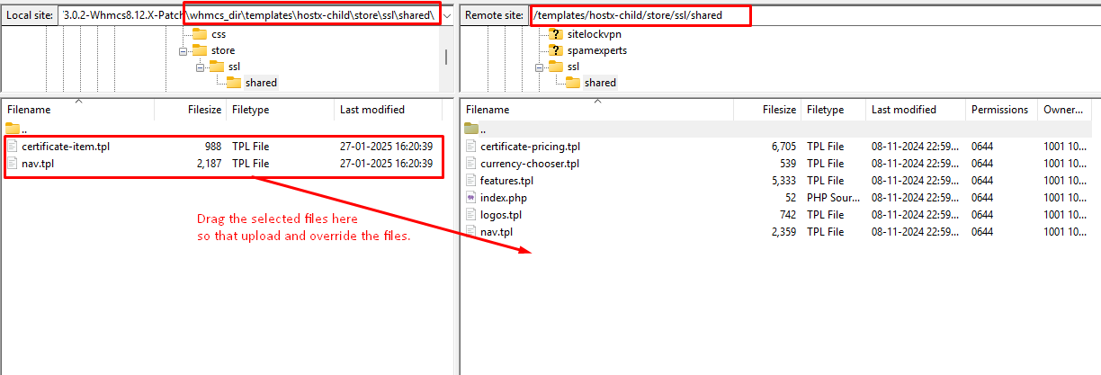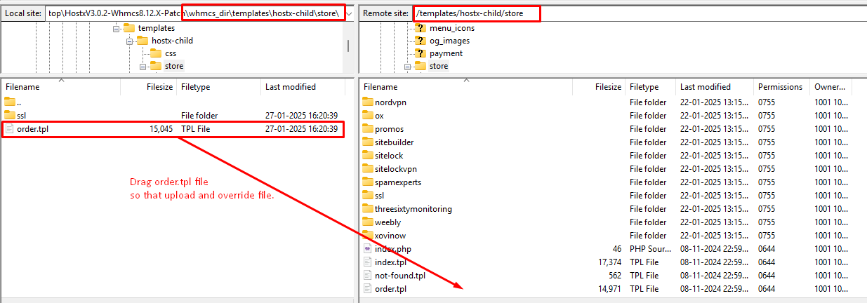 Step 8. Now Drag the “order.tpl” file from the “store” directory to upload and override files as mentioned in the given screenshot below.