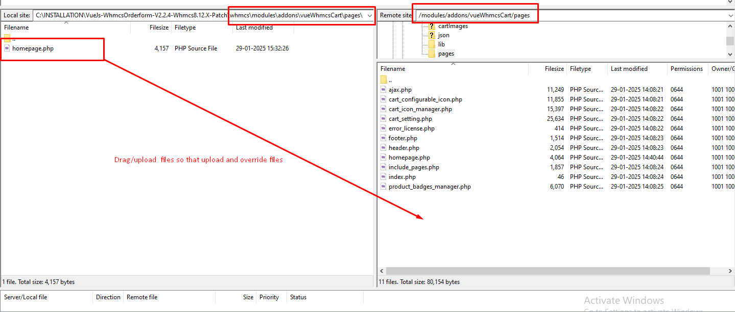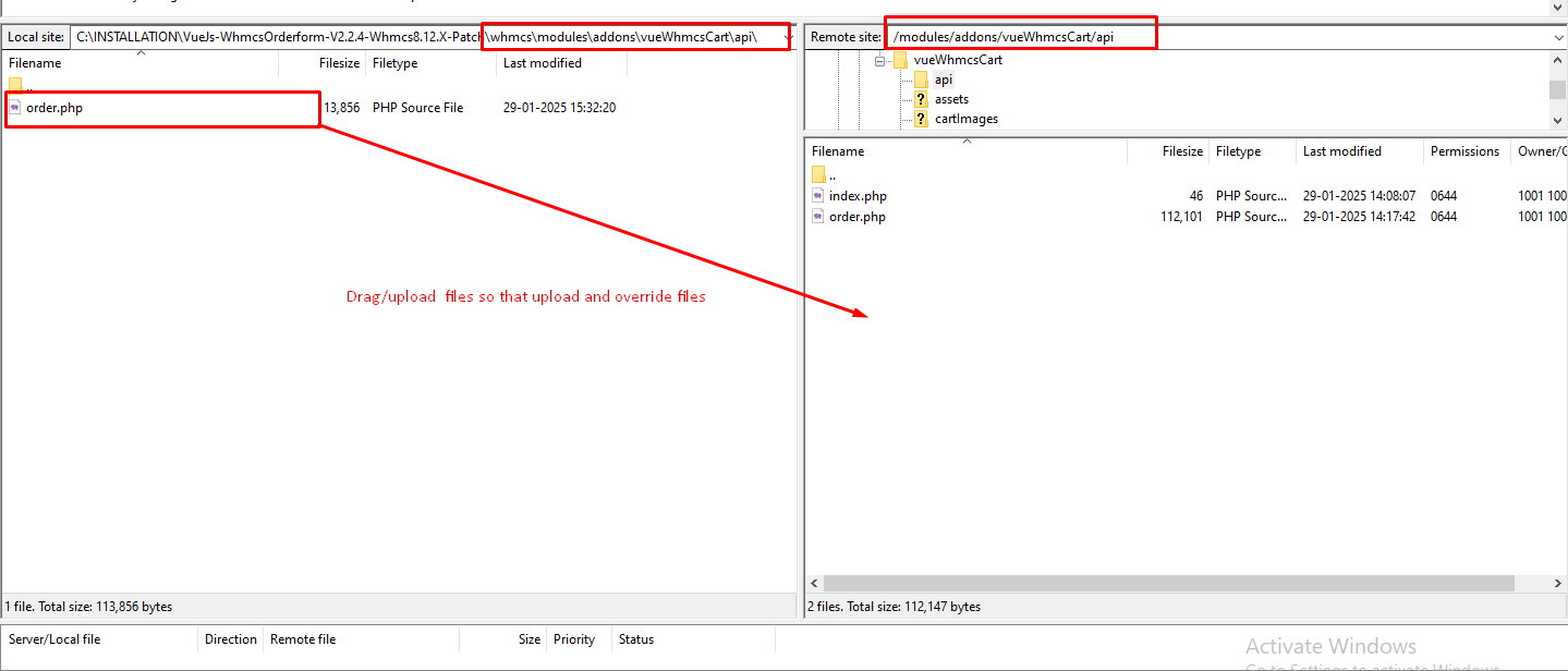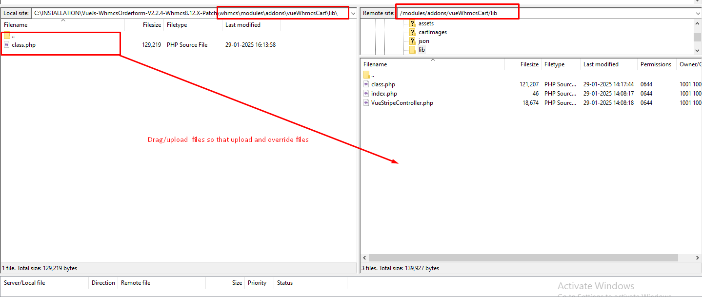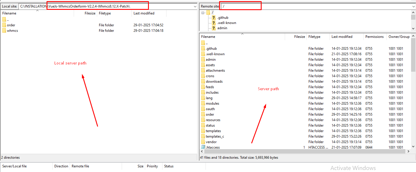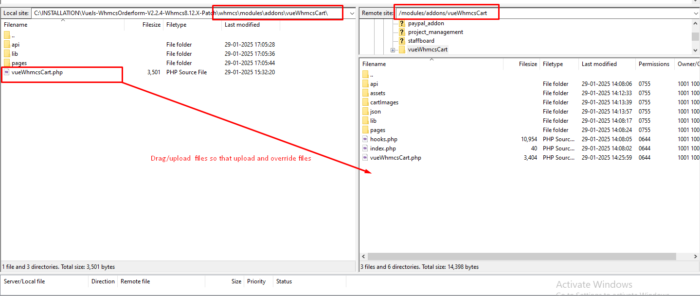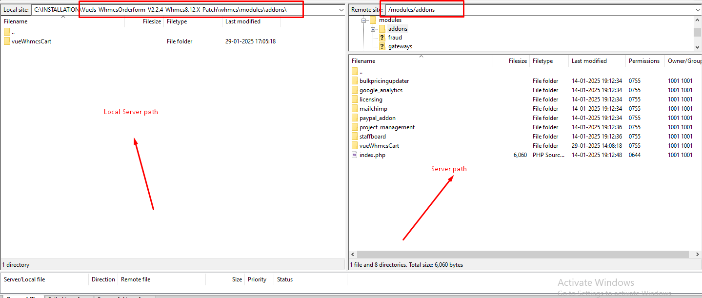 Step 5: Now navigate to the path shown below in the screenshot on both local and server for “vueWhmcsCart” addon files. (\whmcs\modules\addons\ -> In local ) and (/modules/addons-> In server ) to upload the “vueWhmcsCart” addon module files.