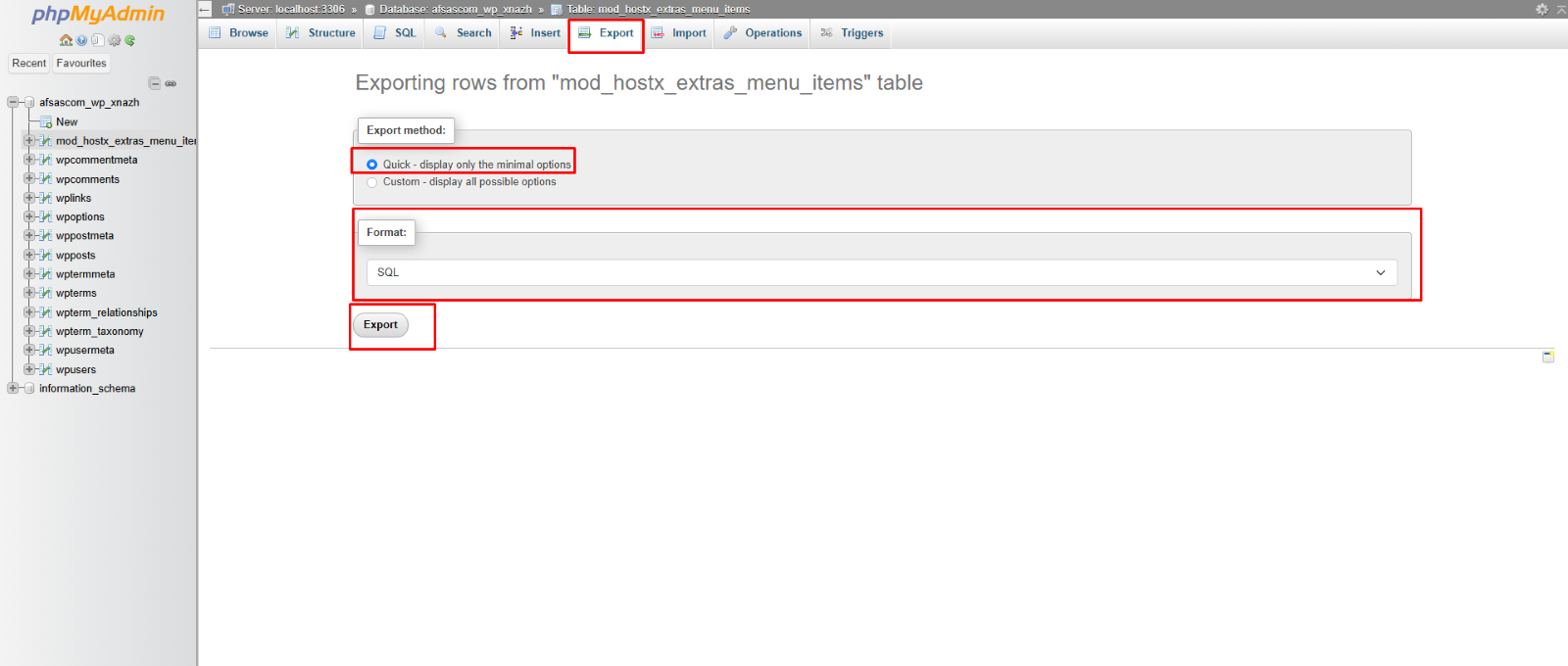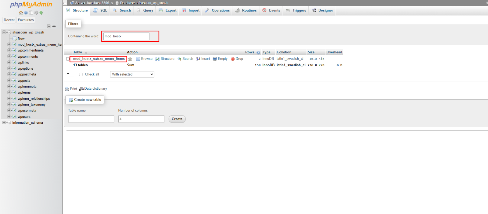 - Browse through the list of tables and identify those that start with "mod_hostx".