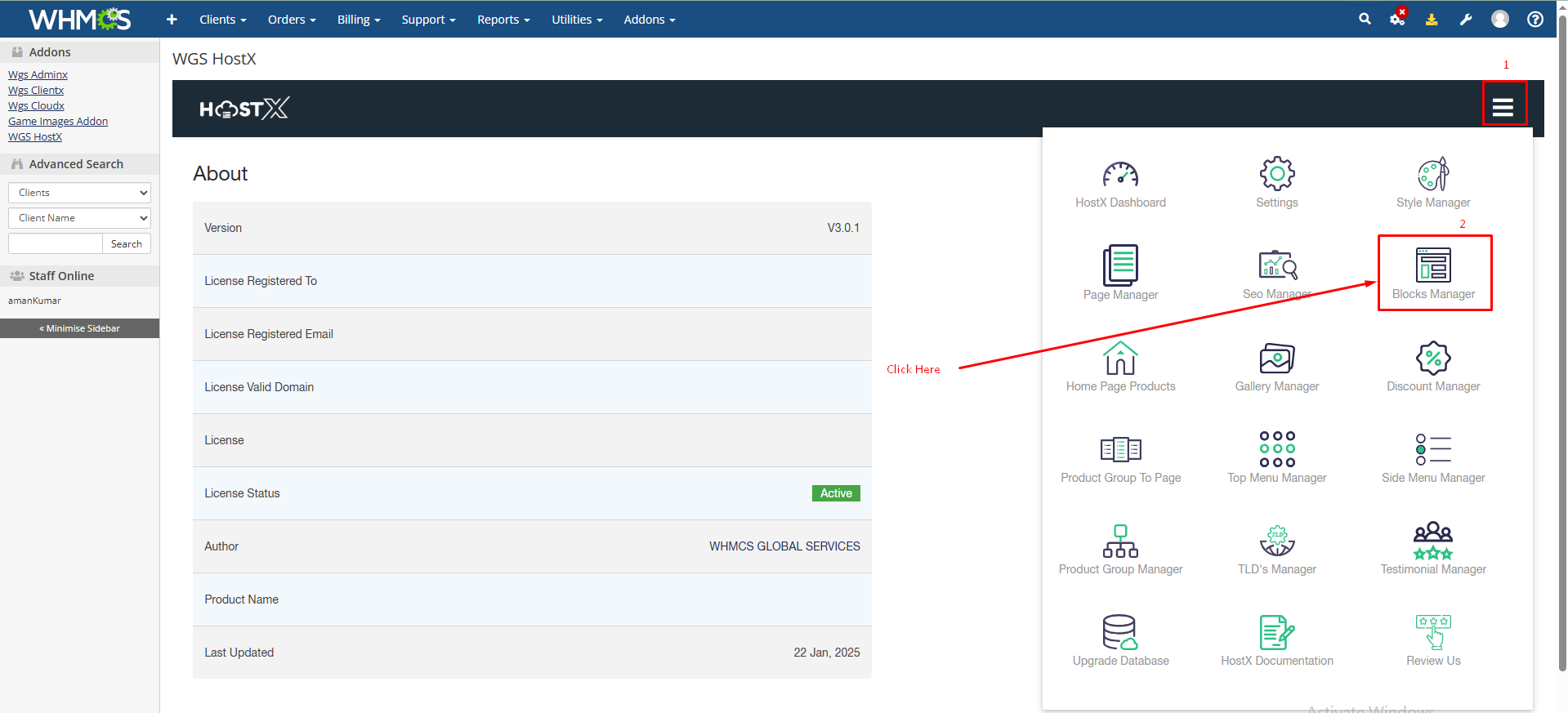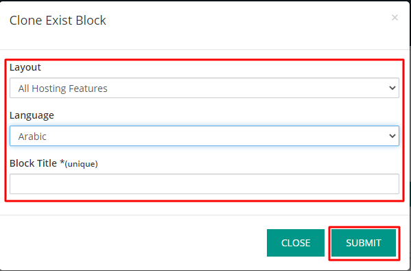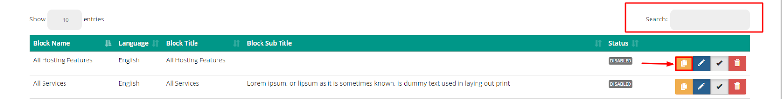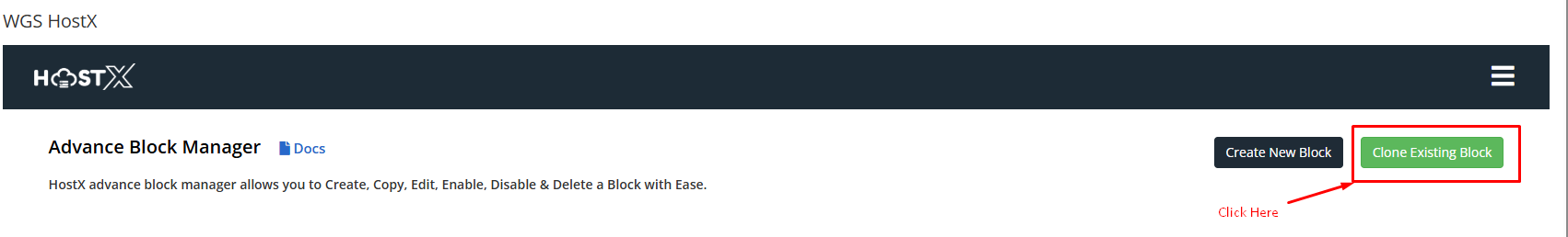 Step 1: Log in to WHMCS Admin Step 2: Go to Add-ons > WGS HostX >Block Manager Step 3. Click on the “Clone Existing Block” button placed on the right-side of the screen. Or,Search the name of block and click on Copy Block icon Step 4. Select the block layout you want to clone, its language, and title for the block. Click Submit.